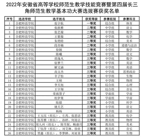 本网讯 10月-12月,由安徽省教育厅主办、阜阳师范大学承办的2022年安徽省高等学校师范生教学技能竞赛成功落下帷幕。疫情防控期间,本次竞赛采用线上评比,即选手提交视频参加比赛,评委线上评审。经过为期数周的评审,最终我院学生在本次竞赛中表现优异,获一等奖1项,二等奖获6项,三等奖19项。
