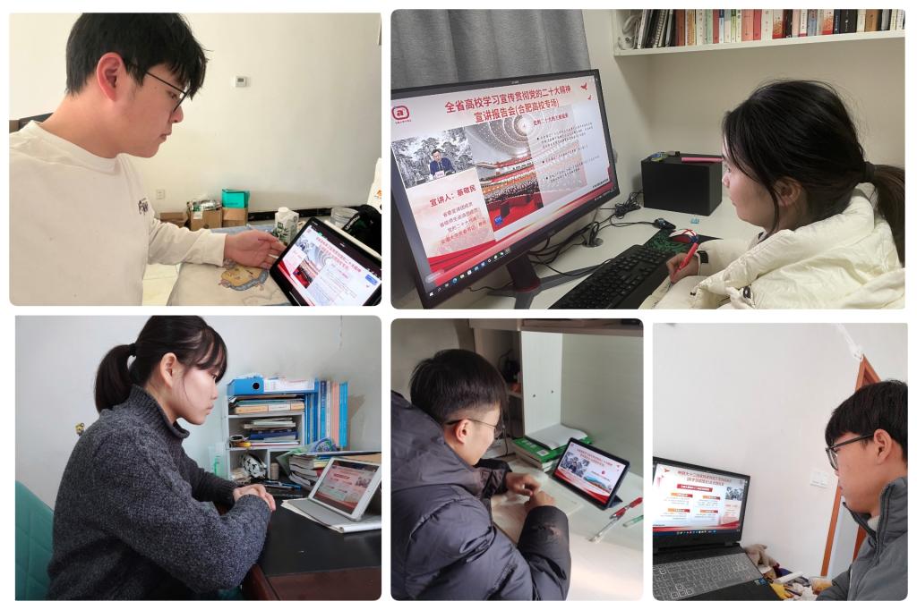 本网讯 1月4日下午,全省高校学习宣传贯彻党的二十大精神宣讲报告会(合肥高校专场)在安徽大学举行。省委宣讲团成员、省级师生巡讲团成员、党的二十大代表、安徽大学党委书记蔡敬民教授为广大师生宣讲党的二十大精神。我院党委高度重视,认真组织党员干部、思政课教师、专职辅导员、广大学生通过收看线上直播的方式聆听了宣讲报告。