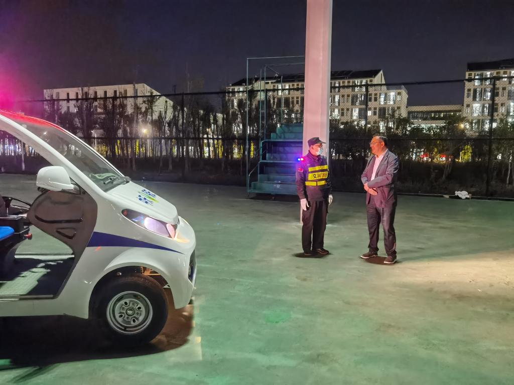 夜色蓉蓉,校园之中,安保人员不间断进行校园常态巡查,徐成钢看望了正在当值巡逻的保安人员,感谢他们的辛勤努力付出,要求大家一定要站好岗、当好值,守护好校园的安全稳定。