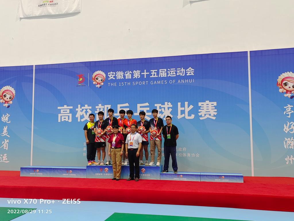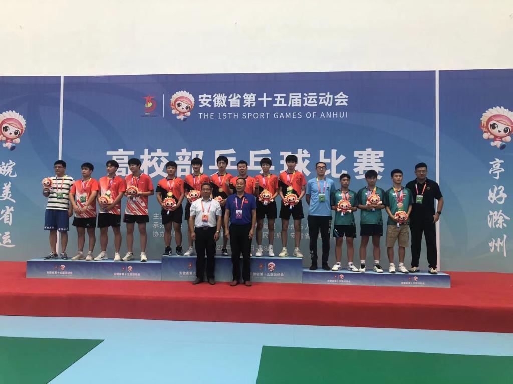 本网讯 8月24日-8月29日,由省政府主办,省教育厅、省体育局、滁州市人民政府承办的安徽省第十五届运动会高校部乒乓球比赛在安徽科技学院举行。本次比赛设有甲组(非体育专业本科院校)、乙组(非体育专业高职院校)、丙组(体育专业本科院校)三个组别。共有来自全省40所高校的304名运动员参赛。我院组队参加了丙组男子项目比赛,包揽男子单打前三名,收获男子双打冠军,获得男子团体冠军的好成绩,并获得体育道德风尚奖。