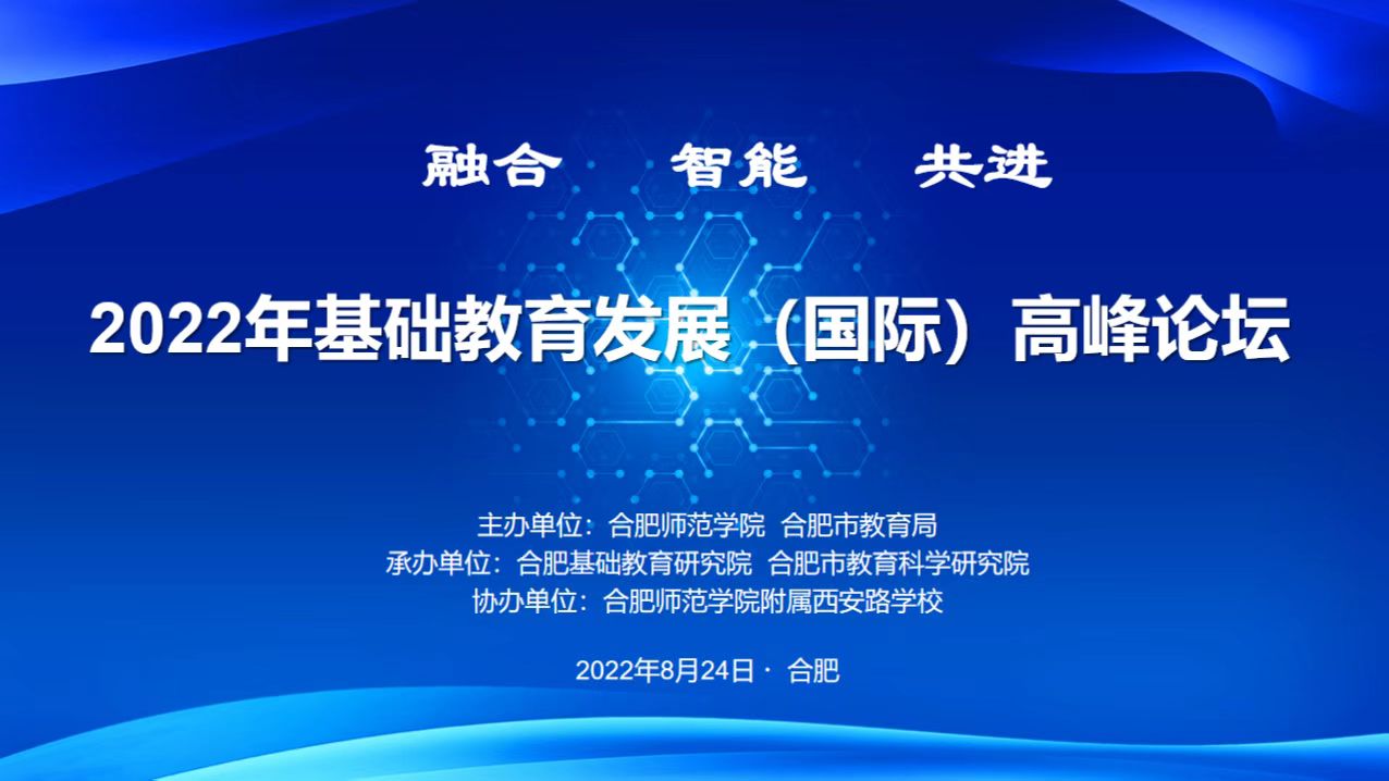 本网讯 8月24日下午,2022年度基础教育发展(国际)高峰论坛在beat365唯一官方网站附属西安路学校举行。本次论坛以“融合·智能·共进”为主题,由合肥市教育局、beat365唯一官方网站共同主办,合肥基础教育研究院、合肥市教育科学研究院联合承办。论坛聚力推动基础教育协同共进,融合发展,为区域基础教育高质量发展探索新路径、提供新方案。