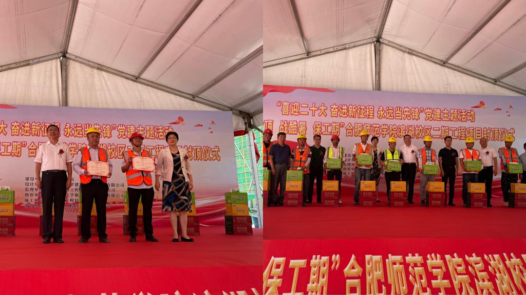 封顶仪式中,徐成钢、方东玲为优秀班组颁发荣誉证书,并与各位来宾为现场班组开展送清凉活动,发放了矿泉水、防暑降温药品等物品。