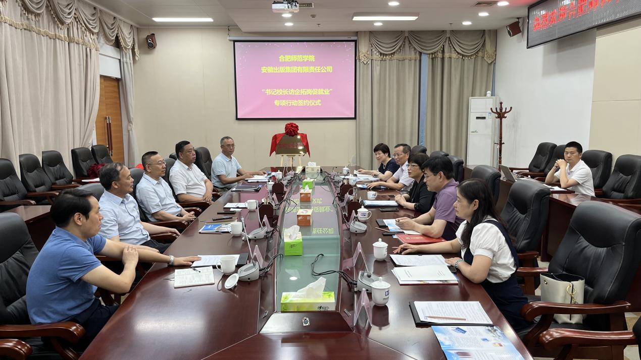 本网讯 为深入贯彻落实党中央国务院关于“稳就业”“促就业”决策部署,进一步推进产教学研深度合作,7月9日下午,党委副书记、院长方东玲率队赴安徽出版集团有限责任公司开展“书记校长访企拓岗促就业”专项行动走访签约授牌活动。教师教育学院党委书记穆娟、院长李群、安徽省基础教育改革与发展协同创新中心执行主任钱立青、文学院党委书记李旺生等人陪同前往。安徽出版集团党委书记、董事长马占文,党委副书记袁超,党委委员、时代出版传媒股份有限责任公司总经理郑可,时代出版传媒股份有限责任公司党群工作部主任何清华、安徽星报传媒有限责任公司社长王能玉热情接待了方东玲一行。