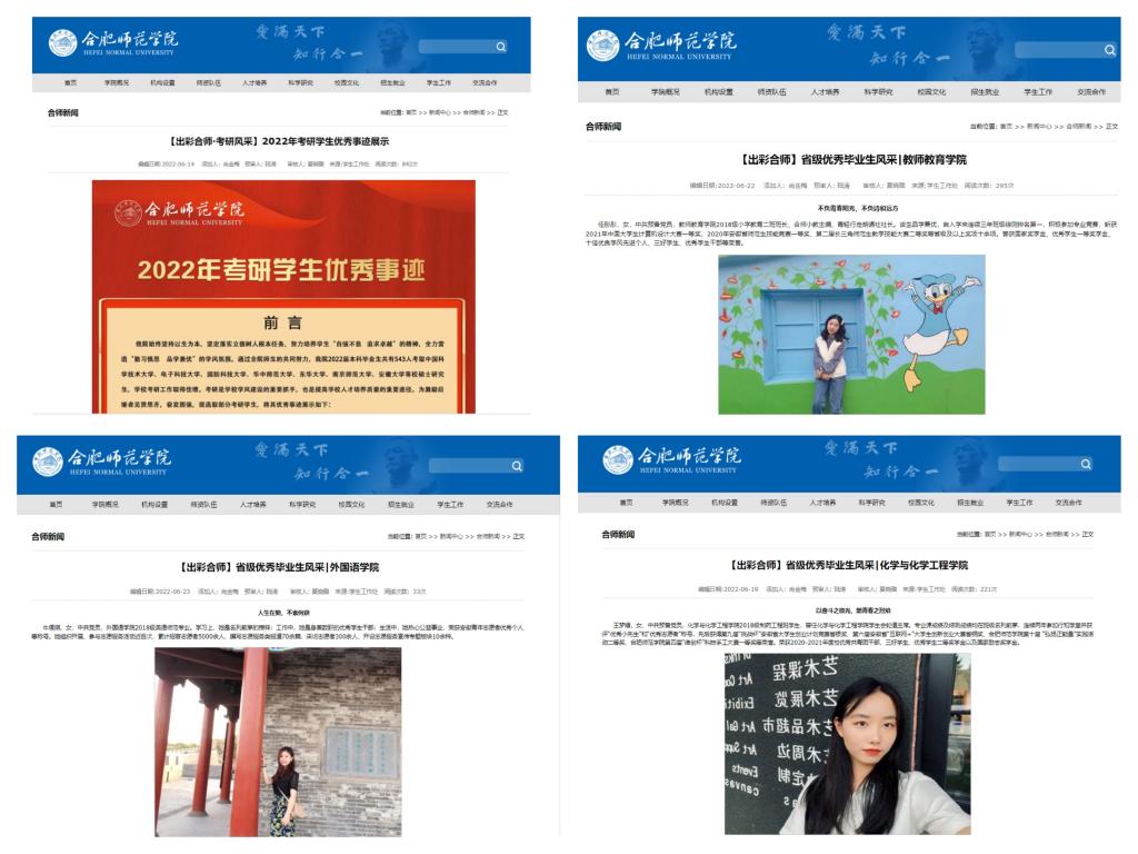 学院组织开展2022年优秀毕业生评选,1070名同学获评校级“三好学生”、优秀学生干部、优秀华业生,156名同学获评安徽省普通高等学校优秀毕业生,发布15期“出彩合师”毕业生风采展,发挥毕业生的示范作用和辐射效应。各二级学院通过经验座谈会、分享交流会,组织毕业生与学弟、学妹就成长历程、学习方法、考研体会、求职感受、志愿服务活动等方面进行经验交流,用青春榜样激励更多学子奋发图强、成长成才,营造了良好的校园学习成长氛围。