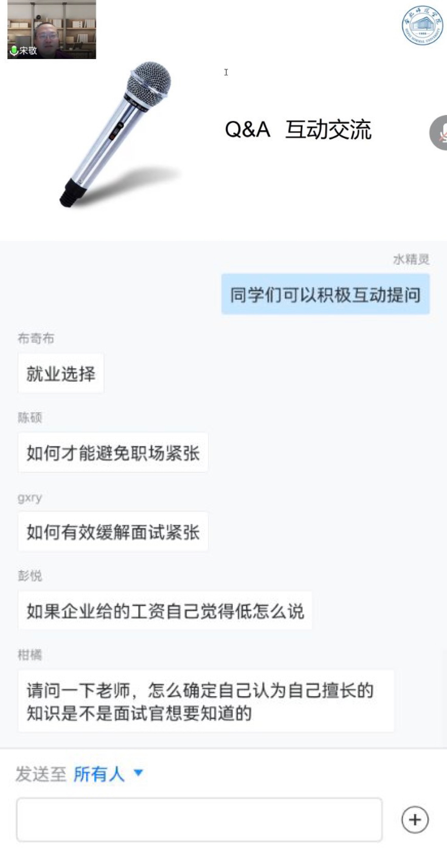 线上直播讲座由佳通轮胎(中国)投资有限公司人力资源部高管、高级经济师、教育部首批全国优秀创新创业导师宋敬担任主讲。宋敬首先分析了国内大学生就业形势,详细介绍了大学生进入职场前的准备事项、求职面试环节的基本情况以及面试全过程。他通过发生在面试等候厅、自我介绍两个环节的真实案例,向同学们生动形象地介绍了面试中经常遇到的问题以及应对方法。在面试全过程中,他分别介绍了开场破冰、自我介绍、人才画像、面试问题以及结尾技巧,重点分析了面试不同类型问题,给同学们分享了七个典型案例,在案例中提炼出面试问题的重要知识点。同学们在线上踊跃提问,积极互动。
