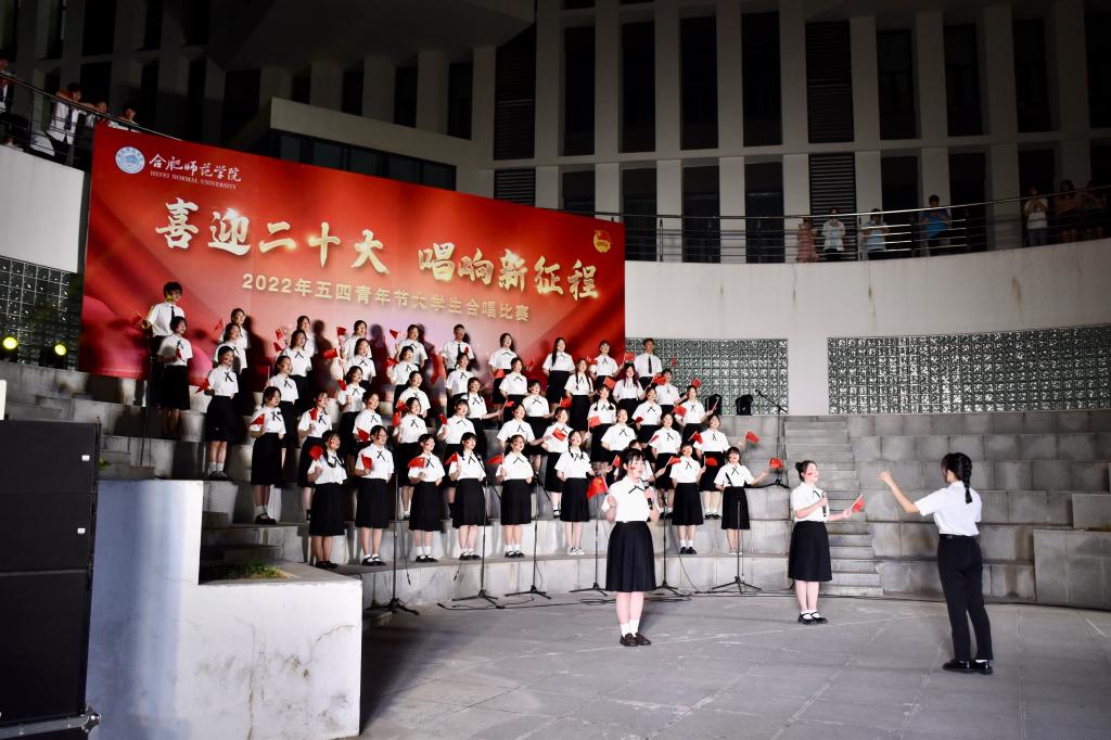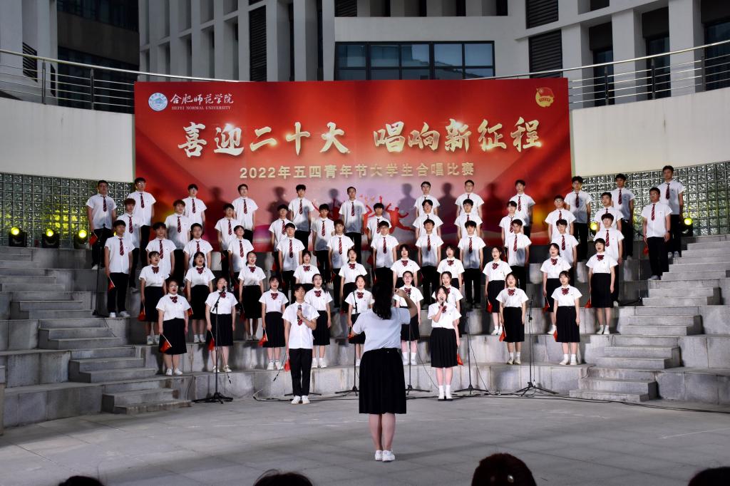 本网讯 为迎接党的二十大胜利召开,深入推进“喜迎二十大、永远跟党走、奋进新征程”主题教育实践活动,5月8日晚上,由院团委主办的“喜迎二十大 唱响新征程”五四大学生合唱比赛在滨湖校区举行。研究生处处长胡玉娟、院团委副书记刁文彬、外国语学院党委副书记马喆、马克思主义学院组织员束道锋,各二级学院团组织书记、各参赛学院指导老师及学生代表等400余人到场观看。音乐学院教师苏丽丽、谢梦珂、谭映、潘怡担任比赛评委。