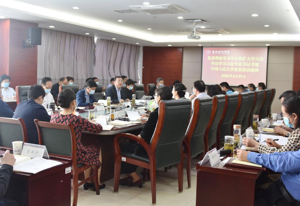 本网讯 4月27日上午,学院举行党委理论学习中心组扩大会议,传达学习习近平总书记考察中国人民大学重要讲话精神,部署贯彻落实工作。党委书记徐成钢主持会议并讲话。党委理论学习中心组成员出席会议,各院系级党委(党总支、直属党支部)书记,各学院院长、各部门主要负责人参加会议。