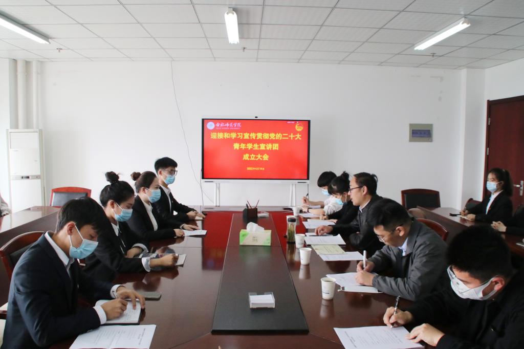 本网讯 4月14日中午,学院迎接和学习宣传贯彻党的二十大青年学生宣讲团成立大会在锦绣校区行知楼、腾讯会议举行。党委宣传部、院团委负责人,院团委全体人员及党史学习教育学生宣讲团30名同学参加会议。会议由院团委挂职副书记宗彪主持。