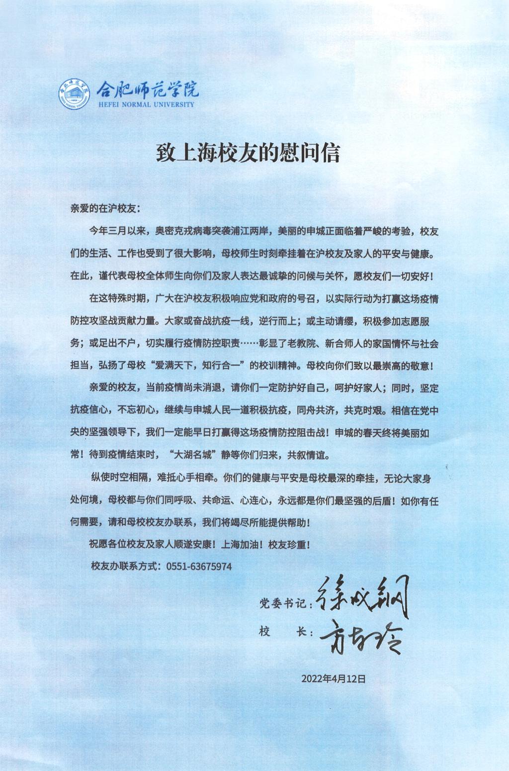 在沪校友的健康与平安时刻牵动着全校师生的心。近日,学校向在沪校友发出了《致上海校友的慰问信》,表达学校全体师生对校友们最深切的关心与关怀,希望他们多加防护,保护好自已和家人;赞扬他们积极抗疫,彰显了家国情怀与社会担当;鼓励他们坚定信心,共抗疫情;表示母校一直与他们同在,永远是他们最坚强的后盾。