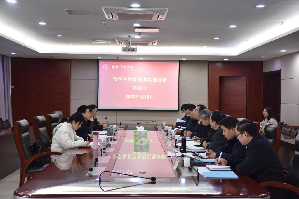 本网讯 1月6日上午,受省教育厅委托,中国科学技术大学国际合作与交流部副部长、安徽省外国留学生教育管理学会会长蒋家杰,安徽医科大学国际教育学院院长吴强,安徽中医药大学人文与教育交流学院党总支副书记桂大鹏,安徽省教育厅外事处四级主任科员奚洋一行来院考察我院留学生招收资质。院党委书记徐成钢、副院长谢阳群在行知楼2008会议室接待了考察组一行。院办公室、国际交流与合作处、财务处、后勤处、宣传部和教务处主要负责人参加座谈会。