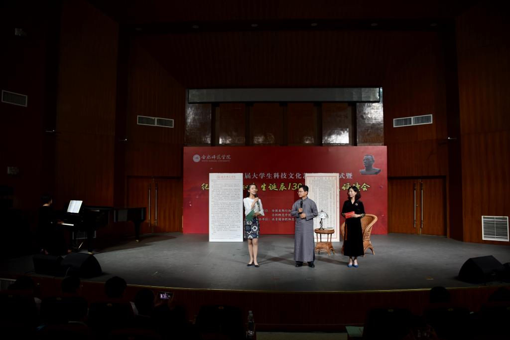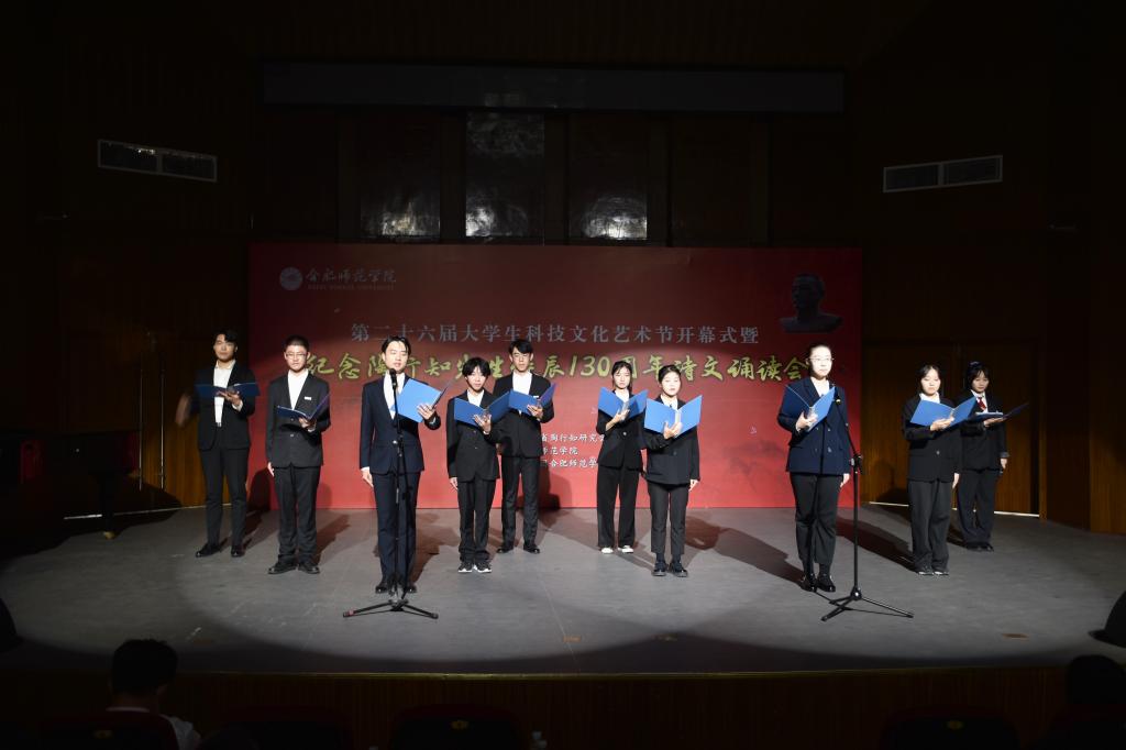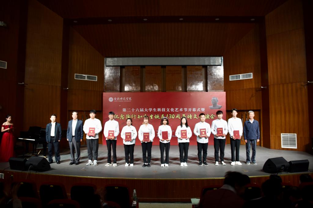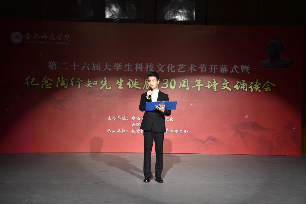 本网讯 10月13日下午,由安徽省陶行知研究会、beat365唯一官方网站主办的学院第二十六届大学生科技文化艺术节开幕式暨纪念陶行知先生诞辰130周年诗文诵读会在锦绣校区音乐厅隆重举行。上海市陶行知纪念馆副馆长、陶行知曾孙陶侃,中国陶行知研究会副会长、安徽省陶行知研究会会长、院党委书记徐成钢,党委副书记、院长方东玲,副院长谢阳群,副院长姚本先,副院长曹卓良,纪委书记徐文林及学院校园文化建设和“学陶师陶”活动领导小组全体成员,各二级学院党团组织负责人,学生代表到场观看。