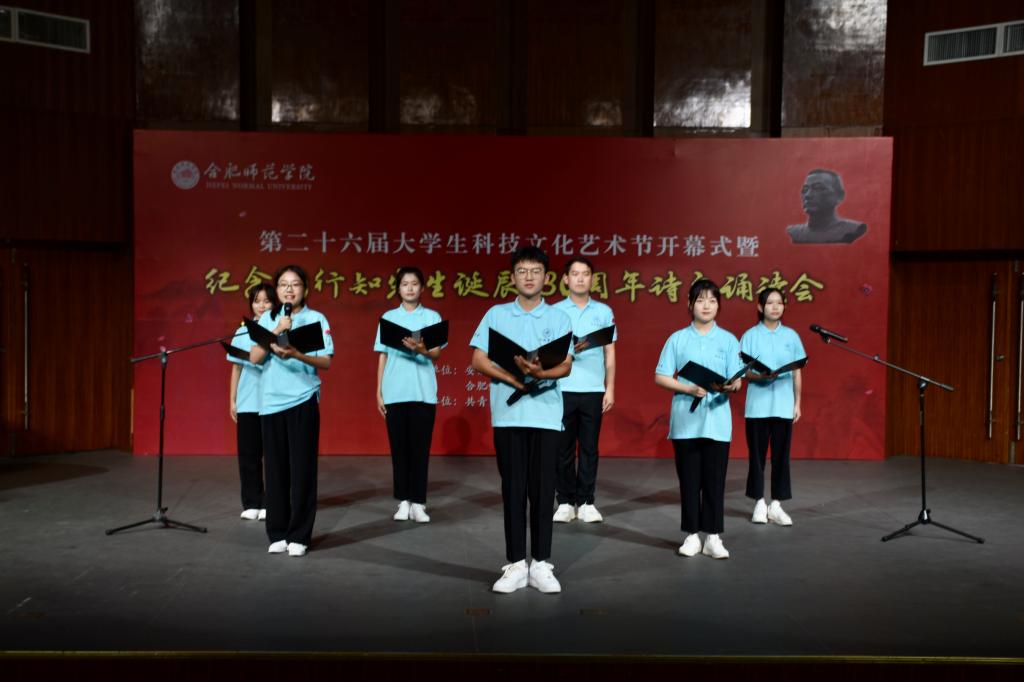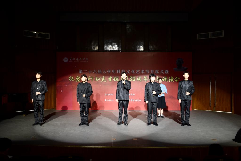 院团委的《知行求真》拉开了诵读会的序幕,让在场师生仿佛回到了那个漫漫求索的年代;教师教育学院的《中国乡村教育之根本改造》将眼光转向乡村,带我们共赏了中国乡村教育的知与行;心有阳光、踏实践行,用今天的创造决定明天的模样,院广播台一首《创造宣言》在人们心中埋下创造的种子;风华正茂少年时,桃李芬香满天下,音乐学院用《行知师颂》深情演绎了陶行知先生的三首诗歌,朴素的语言传达出教育的真谛;一路同行,用爱心和责任心伴随学生成长,辅导员协会带来的《我们都是行知人》阐述着辅导员以陶行知为师的付出和感动;合师院附属西安路学校的老师和同学们带来了《行知路上好少年》,用稚嫩的童声展现“请党放心,强国有我”的坚定信心;青年志愿者联合会一首《行知志愿》让大家明白求知路中“行”之重,展现了合师青年志愿者不怕艰辛的风采;十年树木、百年树人,教工青轻读书会带来的《行知家书:穿越时空的对话》以陶行知先生与新时代的教育者之间穿越百年的书信,展示了教师教育报国、乐育英才的永恒初心;教育如雨、温润无言,安徽省朗诵艺术学会张春声情并茂地朗诵了《第一流的教育家》,令人撼心动情;教工青轻读书会的《捧着一颗心来,不带半根草去》倾情回忆了陶行知先生光辉的一生,声情并茂地诵读了陶行知先生教育思想的精髓要义,台上台下激情互动,全场观众起立齐诵“捧着一颗心来、不带半根草去”,为诵读会画上了圆满的句号。