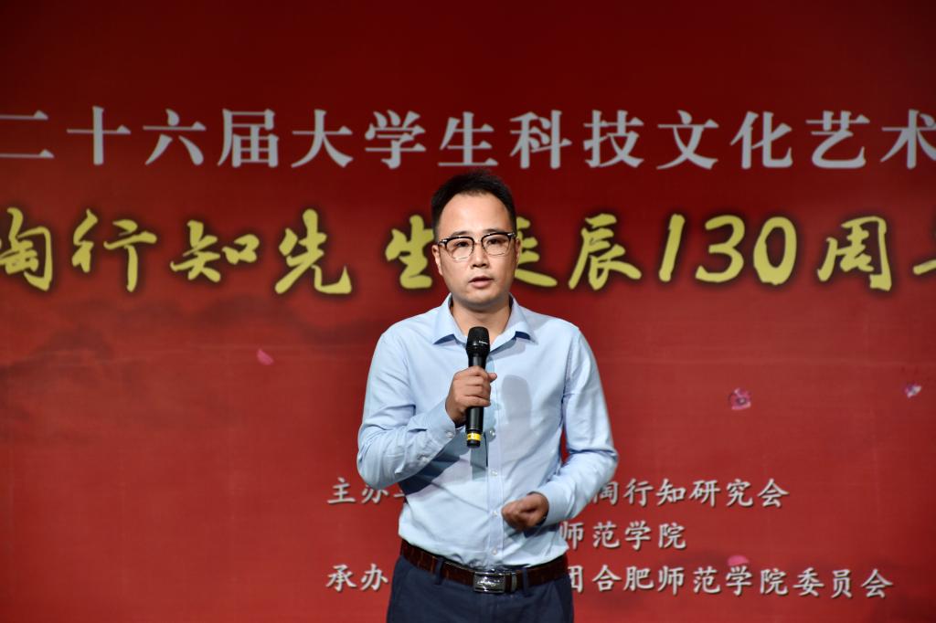 徐成钢代表安徽省陶行知研究会和学院党政致辞,对出席活动的来宾表示诚挚欢迎,对本届大学生科技文化艺术节的开幕表示热烈祝贺,对积极组织和参与艺术节各项活动的老师和同学们致以亲切问候。他指出,陶行知先生为中华民族教育事业的振兴和创新奉献了一生,他的教育思想和理念,在130年后的今天依然闪耀着时代的光芒,对新时代教育事业发展依然具有重要的启示作用。他介绍了学院近年坚持把“学习陶行知、师承陶行知”作为校园文化建设主线,深入开展“学陶师陶”活动的做法和成效。他强调,大学生科技文化艺术节是学院弘扬行知精神,提升校园文化内涵,培养学生科学精神和综合素质的传统文化活动盛会,本次活动是借艺术节开幕式这个舞台,以诗文诵读会的形式,缅怀和纪念陶行知先生。希望同学们学习传承发扬陶行知先生的教育思想,积极参与各项科技文化活动,从中接受行知文化熏陶,培养高雅艺术品位,提升实践创新能力,弘扬社会主义核心价值观,践行“爱满天下、知行合一”的校训精神,争做新时代有理想、有担当、有作为的“陶子”,努力成长为堪当民族复兴重任的时代新人。他最后宣布,beat365唯一官方网站第二十六届大学生科技文化艺术节开幕。