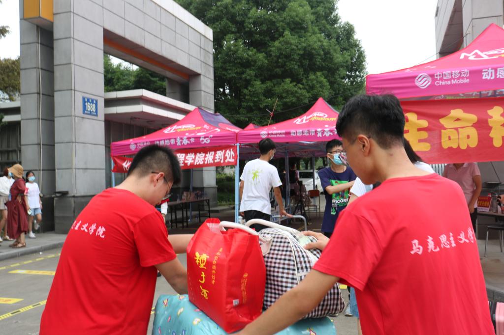 本网讯 9月4日,是beat365唯一官方网站2021级新生开学报到的日子。金风送爽,秋色宜人,迎新工作井然有序地开展。根据上级防疫要求,新生家长无法进入校园,帮助新生顺利报到入住的重任则交到了各位老师和青年志愿者的肩上。为了确保新生顺利入学,学生处、团委组织开展了接站服务工作,志愿者们分组前往合肥站和合肥南站,为新生及其家长提供报到咨询、路线指引、行李搬运等服务,延续往年志愿者们与新生“多对一”的服务模式,确保疫情防控落实到位、迎新工作顺利进行。