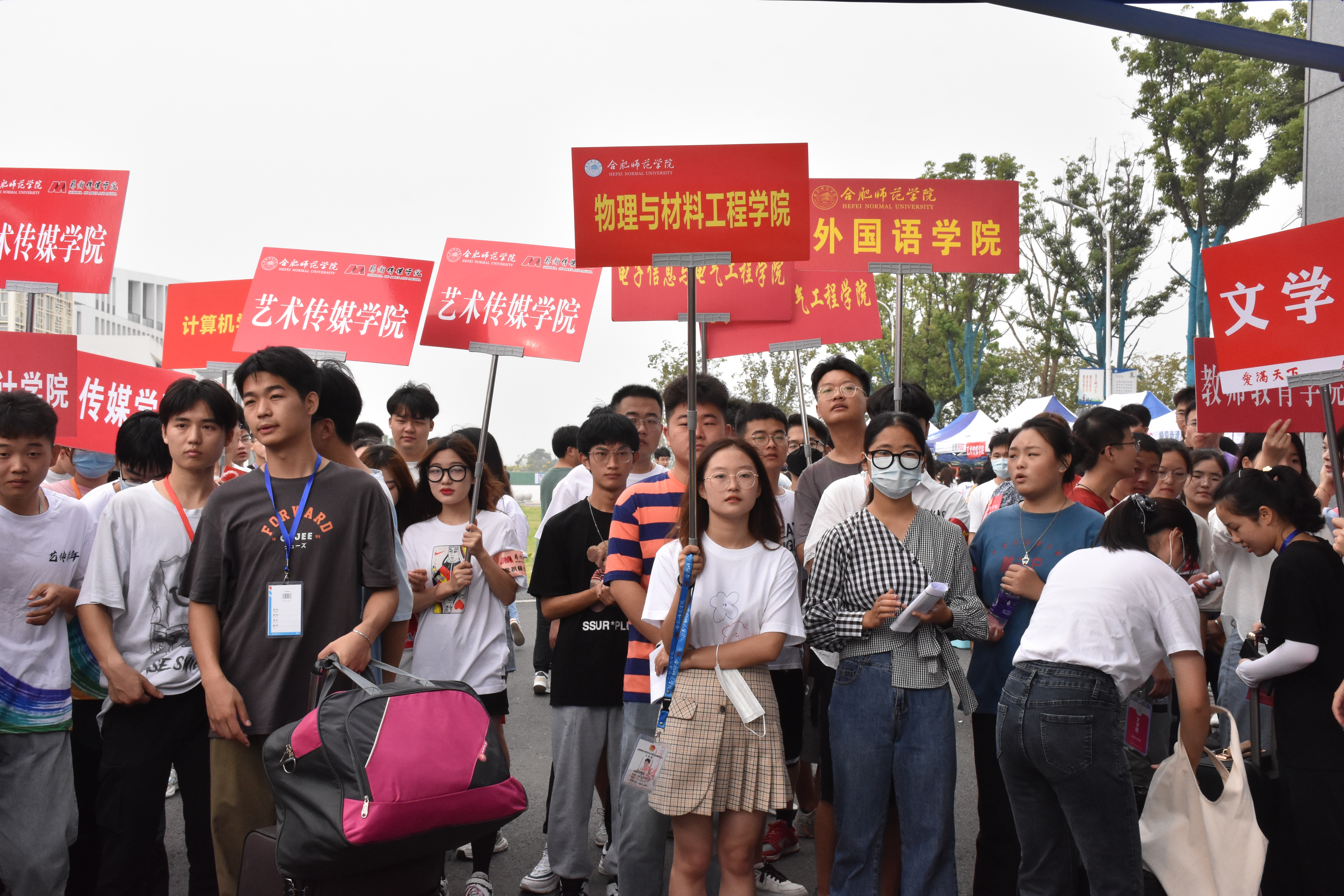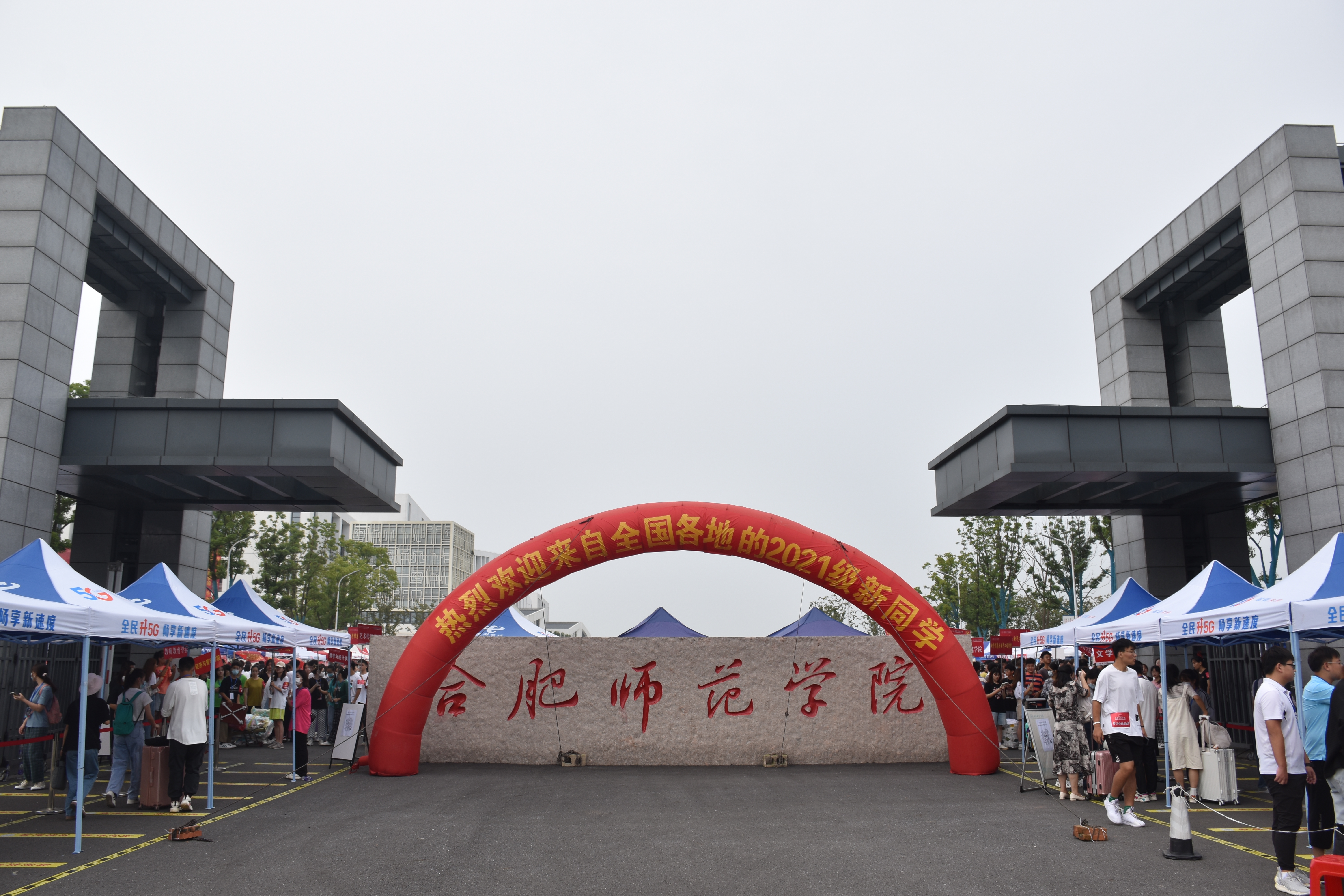 本网讯 秋风送爽,暑气渐消。9月4日,我院滨湖校区、锦绣校区迎来一批崭新的面孔,3500余名学子怀揣着青春梦想和对未来的期许,在这里扬帆启航,逐梦合师。“接过你的行囊,我们就是合师人”。校园内耸立的迎新“拱门”,随处可见的欢迎横幅、迎新帐篷,高高举起的指示牌,丰富多彩的展板共同营造出喜迎新同学的热烈氛围。