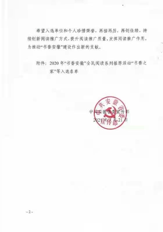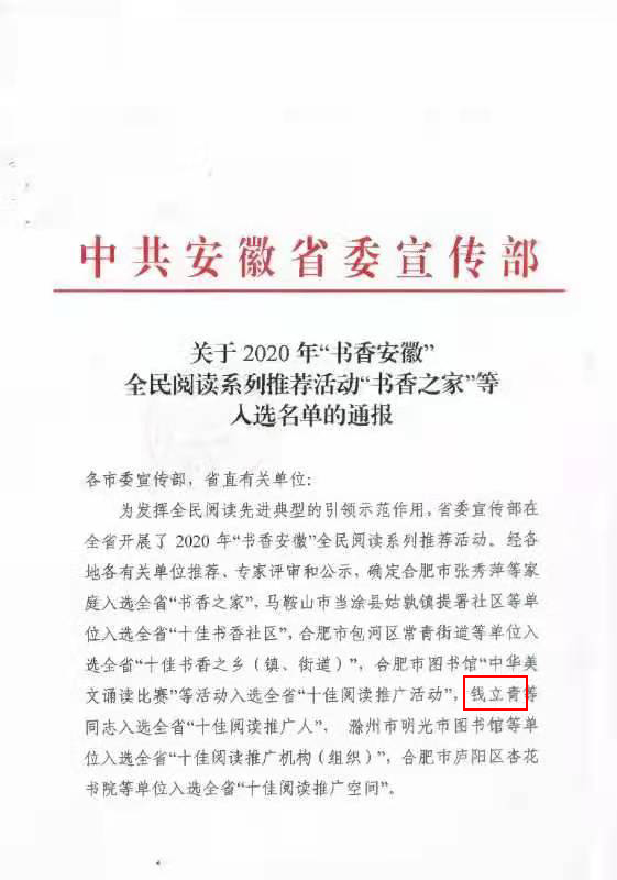 本网讯 近日,中共安徽省委宣传部印发《关于2020年“书香安徽”全民阅读系列推荐活动“书香之家”等入选名单的通报》,beat365机关第二党委书记钱立青入选全省“十佳阅读推广人”。