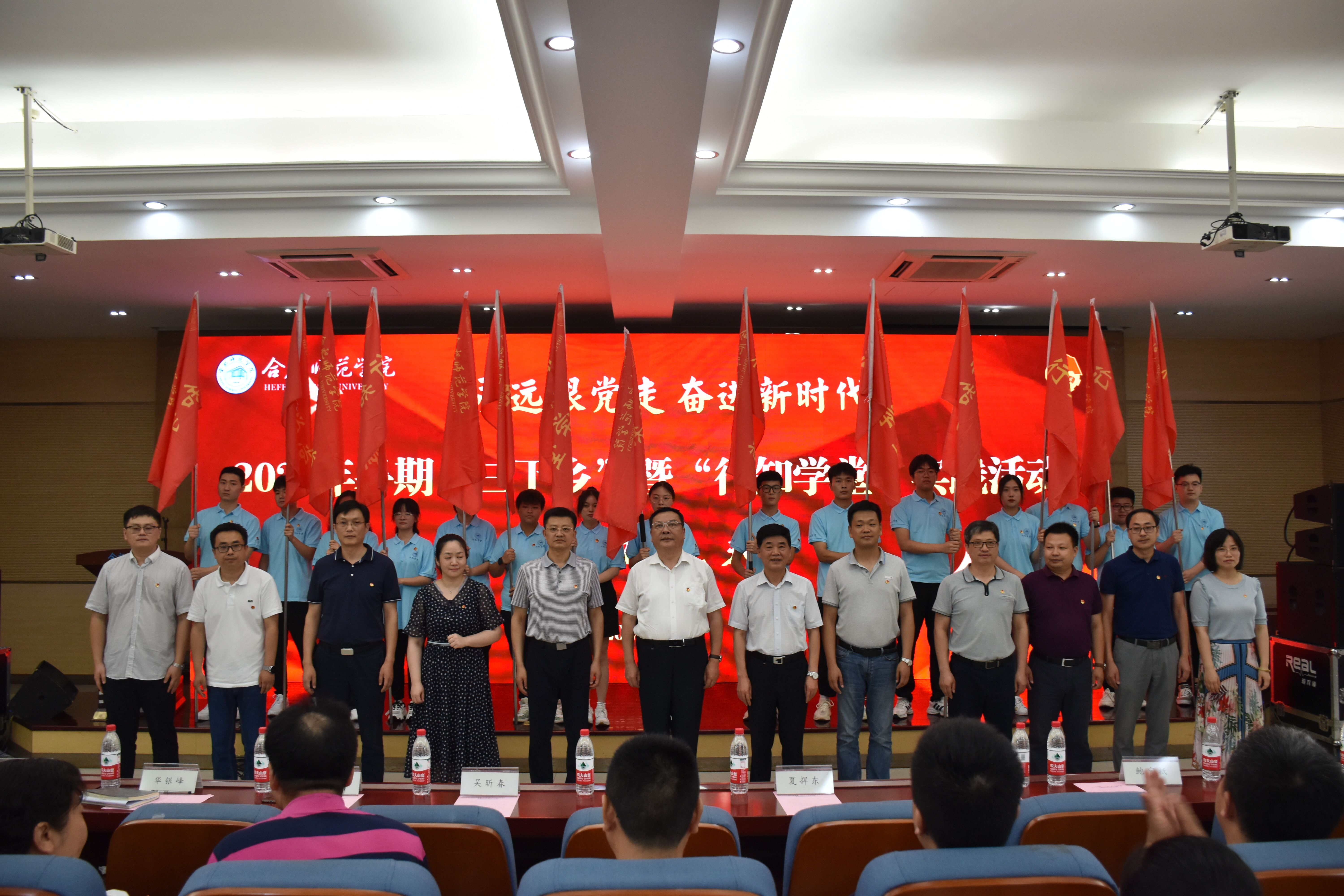 与会领导为各二级学院“行知学堂”实践活动“小先生”代表授旗并合影留念。