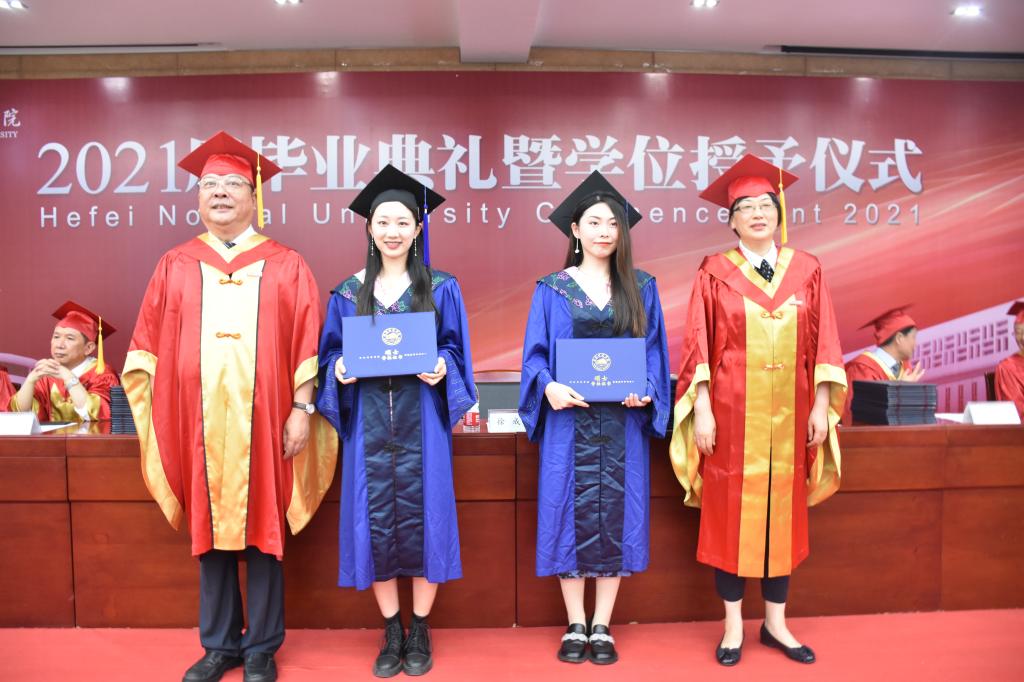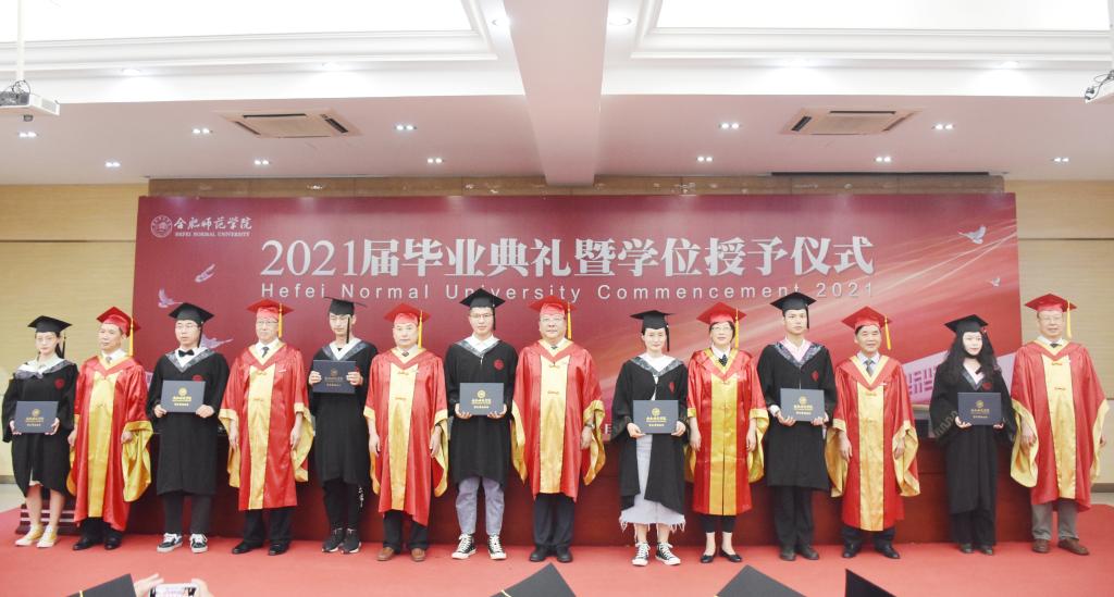 伴随着轻快的乐曲,徐成钢、方东玲为荣获硕士学位、身着硕士服的2021届硕士毕业生授学位,徐成钢、方东玲、李进华、吴昕春、姚本先、曹卓良、徐文林为荣获学士学位、身着学士服的毕业学子们授学位,为他们扶正流苏、颁发学士学位证书并合影留念。激动与喜悦写在每一位毕业生的脸上,温馨与感动留在每一位毕业生心中。