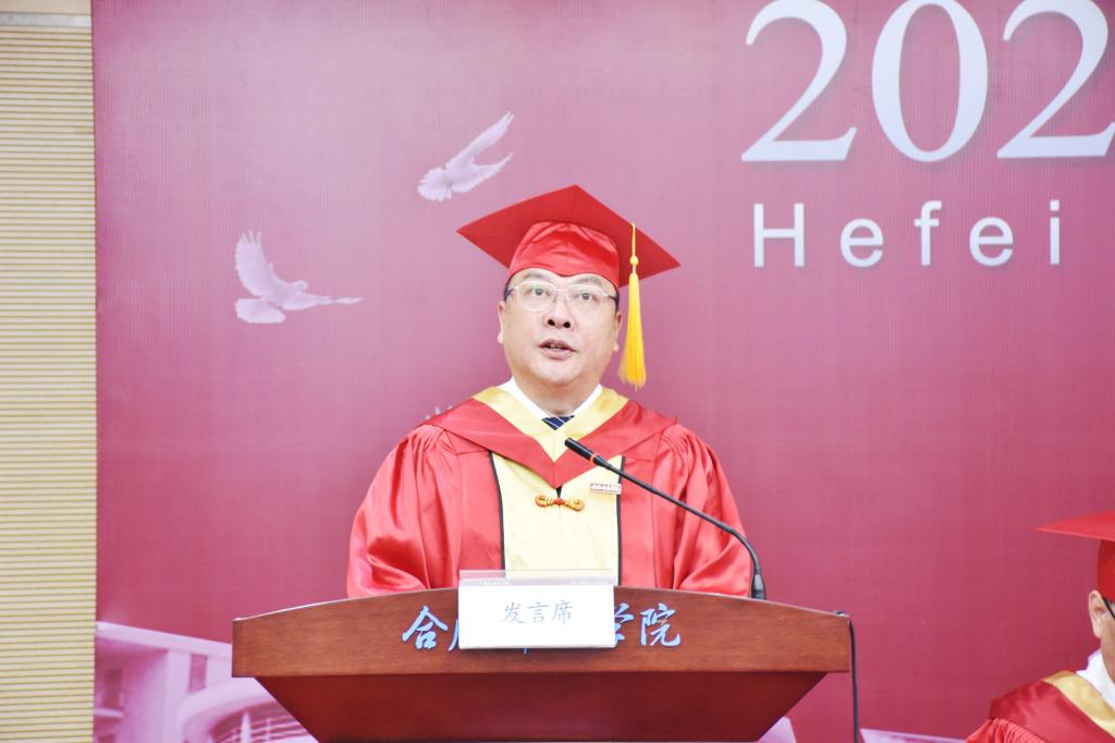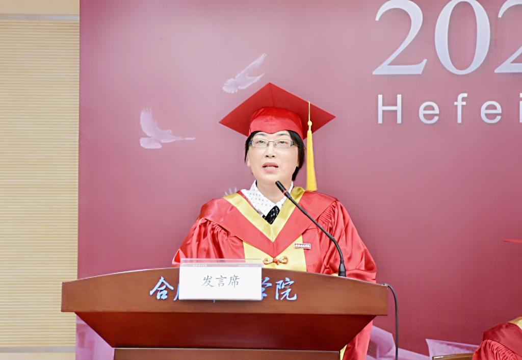 党委副书记、院长方东玲致辞,代表学校向2021届全体毕业生表示热烈祝贺,向辛勤哺育同学们的亲人、悉心指导同学们的老师致以诚挚谢意。她赞扬了本届毕业生在校期间取得的优异成绩,回顾了本届毕业生在校期间学校的发展成就,指出这些成绩的取得,是包括各位同学在内的,全体合师人共同奋斗的结果。同学们与奋进中的合师同风雨、齐奋斗、共担当,见证了彼此的成长与收获。