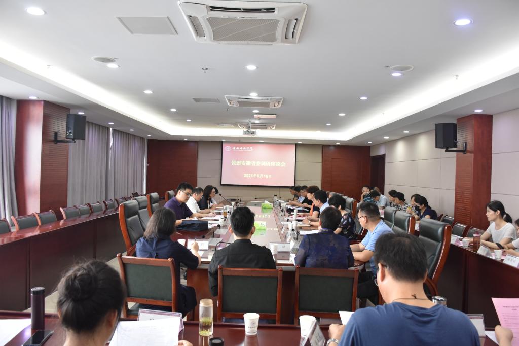 会前,在组织部、统战部、办公室等部门负责人陪同下,院党委书记徐成钢在接待室接待了郑永飞一行,对调研组一行的到来表示热烈的欢迎。徐成钢介绍了学院的办学历程和基本情况,特别是近年来学院坚定地方性、应用型办学定位,坚持举行知旗、走应用路、创师范牌的特色发展之路,地方应用型高水平大学建设取得积极进展。徐成钢表示,学院党委高度重视统战工作和民主党派建设,采取有力措施,积极构建大统战工作格局。他指出,近年来民盟合师支部在民盟安徽省委的重视、关心和指导下,努力加强自身建设,积极建言献策,为学校的改革、建设和发展作出积极的贡献,真诚期待调研组一行对我院的发展多提指导意见。