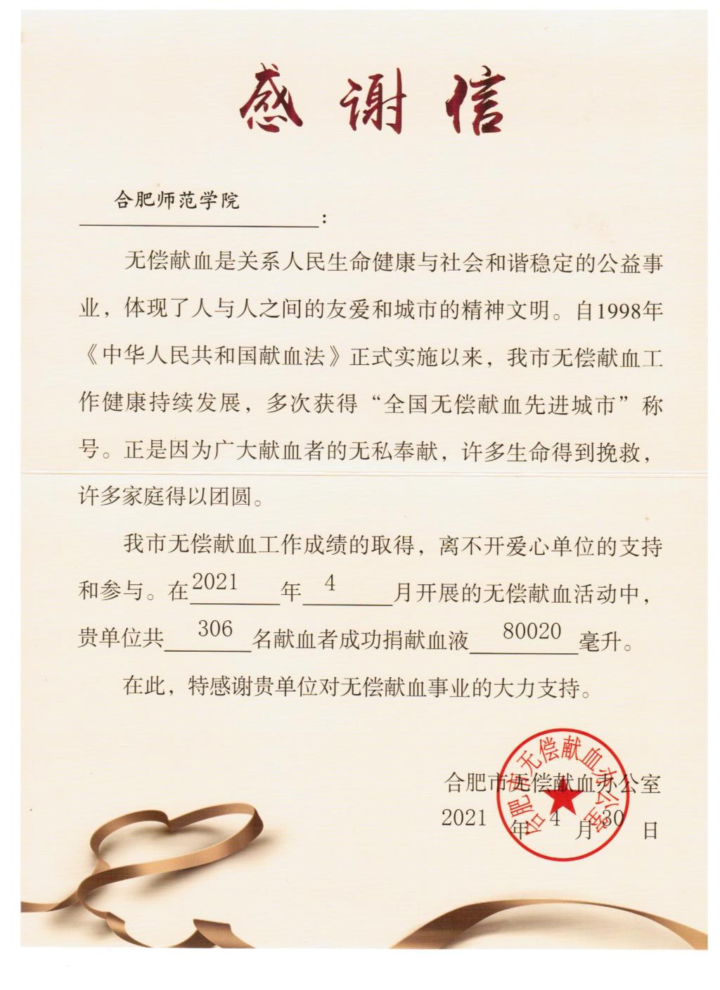 在献血志愿者的积极参与下,本次无偿献血活动取得了良好的成绩,安徽省血液中心王佳老师对我院无偿献血活动成果予以好评:“活动前期,青年志愿者联合会准备周全、宣传有效,大大提高了献血的关注度和影响力。”王佳老师也称赞合师学子无私奉献的精神、积极承担社会责任的担当,感谢积极参加献血的同学们和献血志愿者们在疫情防控常态化下为临床血液保障贡献力量。