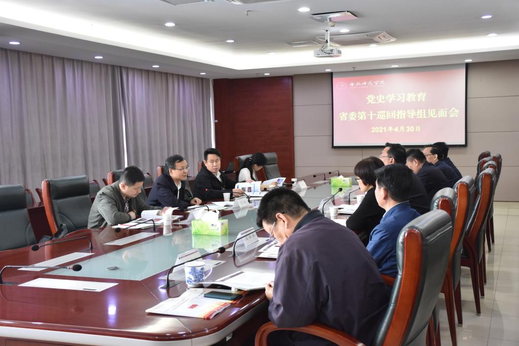 徐成钢向省委第十巡回指导组一行汇报了学校党史学习教育开展情况。徐成钢表示,党史学习教育开展以来,学院全面贯彻落实习近平总书记在党史学习教育动员大会上的重要讲话精神,对标对表中央决策部署和省委工作要求,提高站位,精心组织,围绕“学史明理、学史增信、学史崇德、学史力行”的目标要求,系统谋划和推进各项工作,引导全院党员师生坚定不移学党史、悟思想、办实事、开新局,取得一系列阶段性成果。他表示学院将以本次巡回指导为契机,认真学习贯彻指导组指导意见,坚持目标导向与问题导向相统一,把握节奏,“规定动作”做到位、“自选动作”有特色,严格按计划有序有力抓好后续各项工作,确保党史学习教育落地见效。