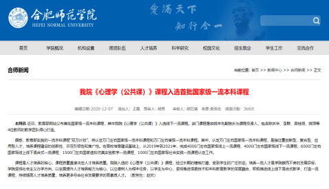 2020年12月,教育部网站公布首批国家级一流本科课程,我院姚本先副院长为负责人,陈庆华、李群、吴桂翎、姚琼等4位教师为团队成员倾心打造的《心理学(公共课)》课程入选线下一流课程。课程是人才培养的核心,课程质量直接决定人才培养质量。我院入选的《心理学(公共课)》课程,经过长期的锤炼打磨,受到学生的广泛欢迎。培养一流人才是学院锲而不舍的发展目标,学院坚持社会主义办学方向,以全面提升人才培养能力为核心,以立德树人为根本任务,以学生为中心,坚持推进信息技术和本科教育教学的深度融合,积极推进线上线下混合式教学,打造一流课程,持续提高人才培养质量,培养更多符合社会发展要求的高素质人才。