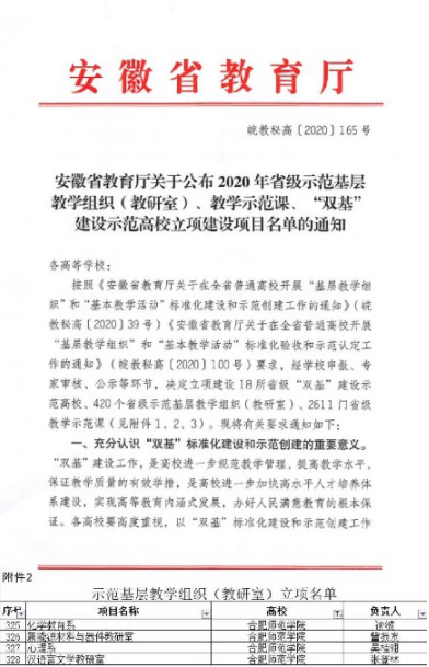 本网讯 近日,安徽省教育厅示范基层教学组织(教研室)、教学示范课名单公示。beat365化学教育教研室、新能源材料与器件教研室、心理系教研室、汉语言文学教研室等4个教研室获批省级示范基层教学组织(教研室),张雁《细胞生物学》等63门课程获省级教学示范课。