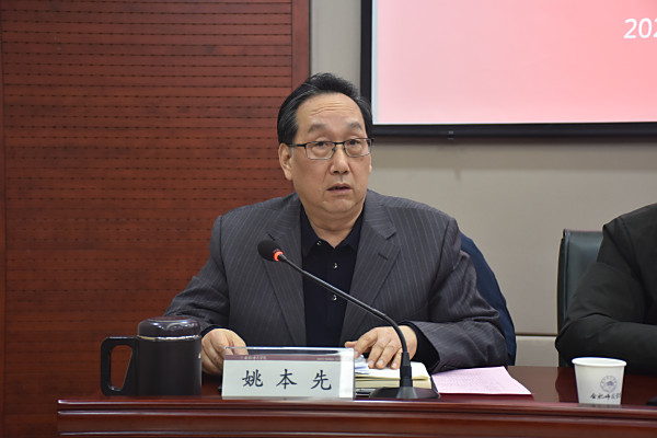 副院长姚本先从学校和专业两个层面介绍了化学师范专业认证专家组的肯定意见,并从制度和机制建设、培养目标和毕业要求达成、课程与教学、合作与实践、学生发展、质量保障等六个方面对专家提出的问题进行反馈。