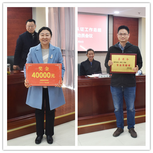 党委副书记吴昕春宣读了《关于授予化学(师范)专业“专业认证贡献奖”荣誉称号的决定》,副校长谢阳群、曹卓良分别为化学专业认证颁发嘉奖令和奖金。