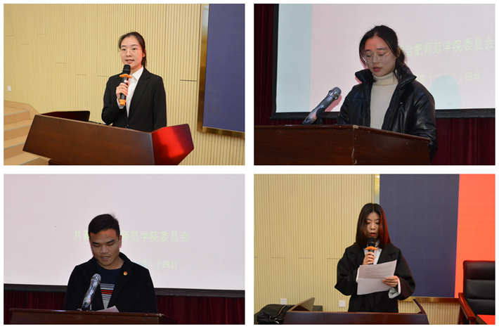 经济与管理学院2019级财务管理专业高宏艳同学与化学与化学工程学院2020级制药工程专业朱梦飞同学作为老团员代表发言,数学与统计学院2020级经济统计学专业邱佳琪同学和生命科学学院2020级食品质量与安全专业陈钰同学作为新团员代表发言。