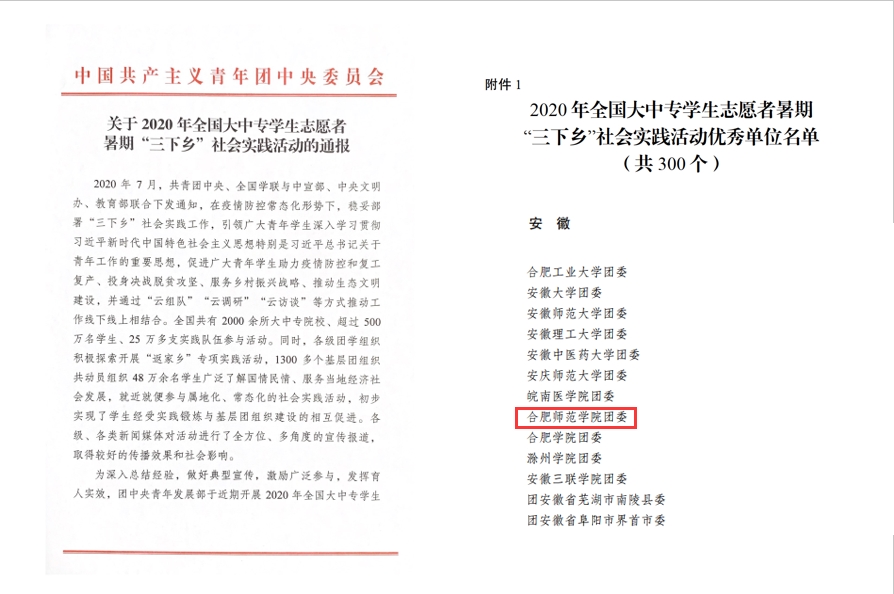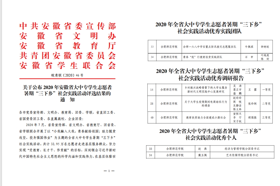 又讯,近日,省委宣传部、省文明办、教育厅、团省委、省学联联合公布了2020年安徽省大中专学生志愿者暑期“三下乡”社会实践活动评选结果,beat365获得多项表彰。青年志愿者联合会“合师一六八中学安置点防汛救灾志愿服务队”、文学院“青春‘疫’行教育扶贫实践团队”2支团队获评2020年全省大中专学生志愿者暑期“三下乡”社会实践活动优秀实践团队;经济与管理学院团委书记赵燕、艺术传媒学院团委书记戴玉佩2名教师获评2020年全省大中专学生志愿者暑期“三下乡”社会实践活动优秀个人;3篇调研报告获评2020年全省大中专学生志愿者暑期“三下乡”社会实践活动优秀调研报告。(校团委)