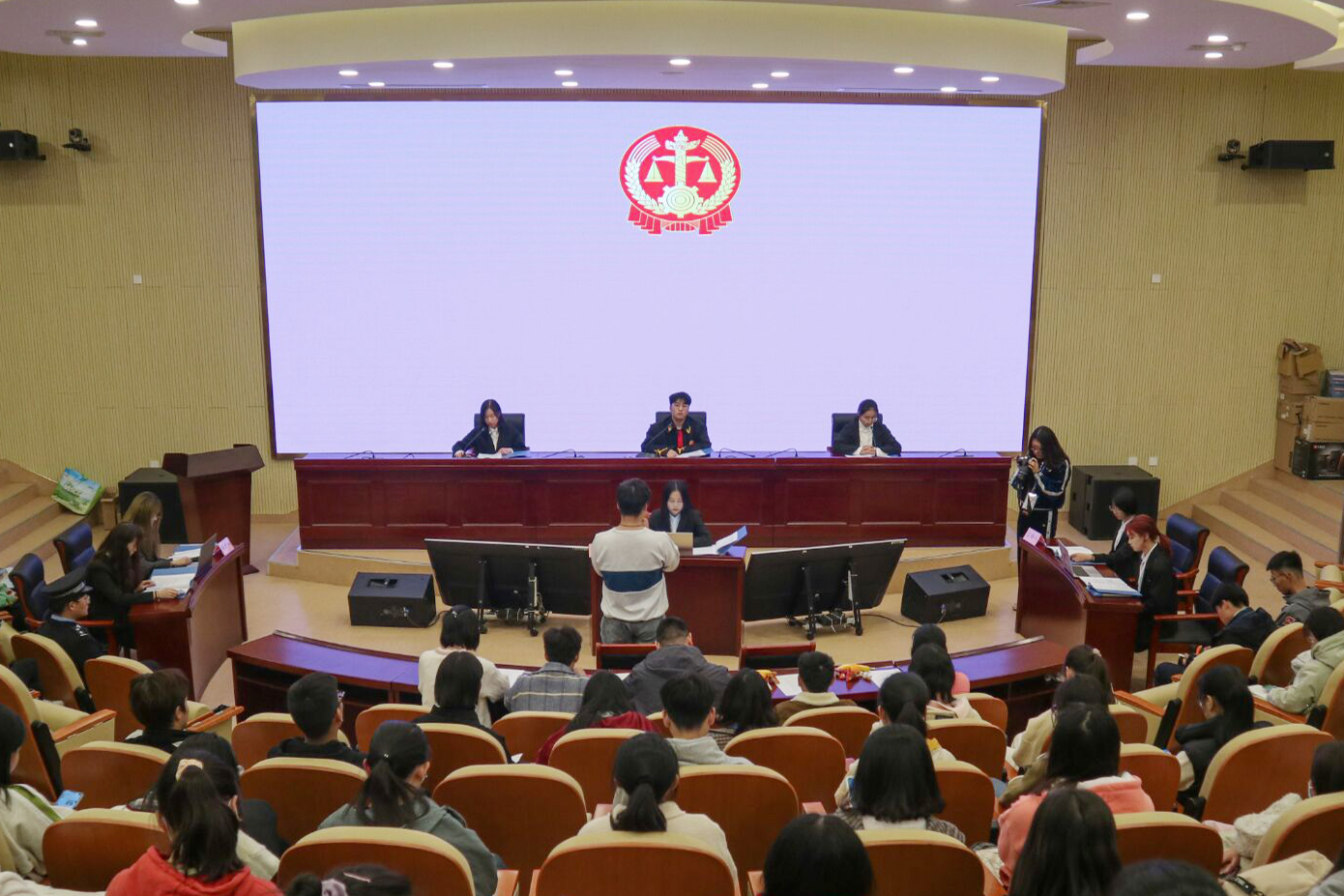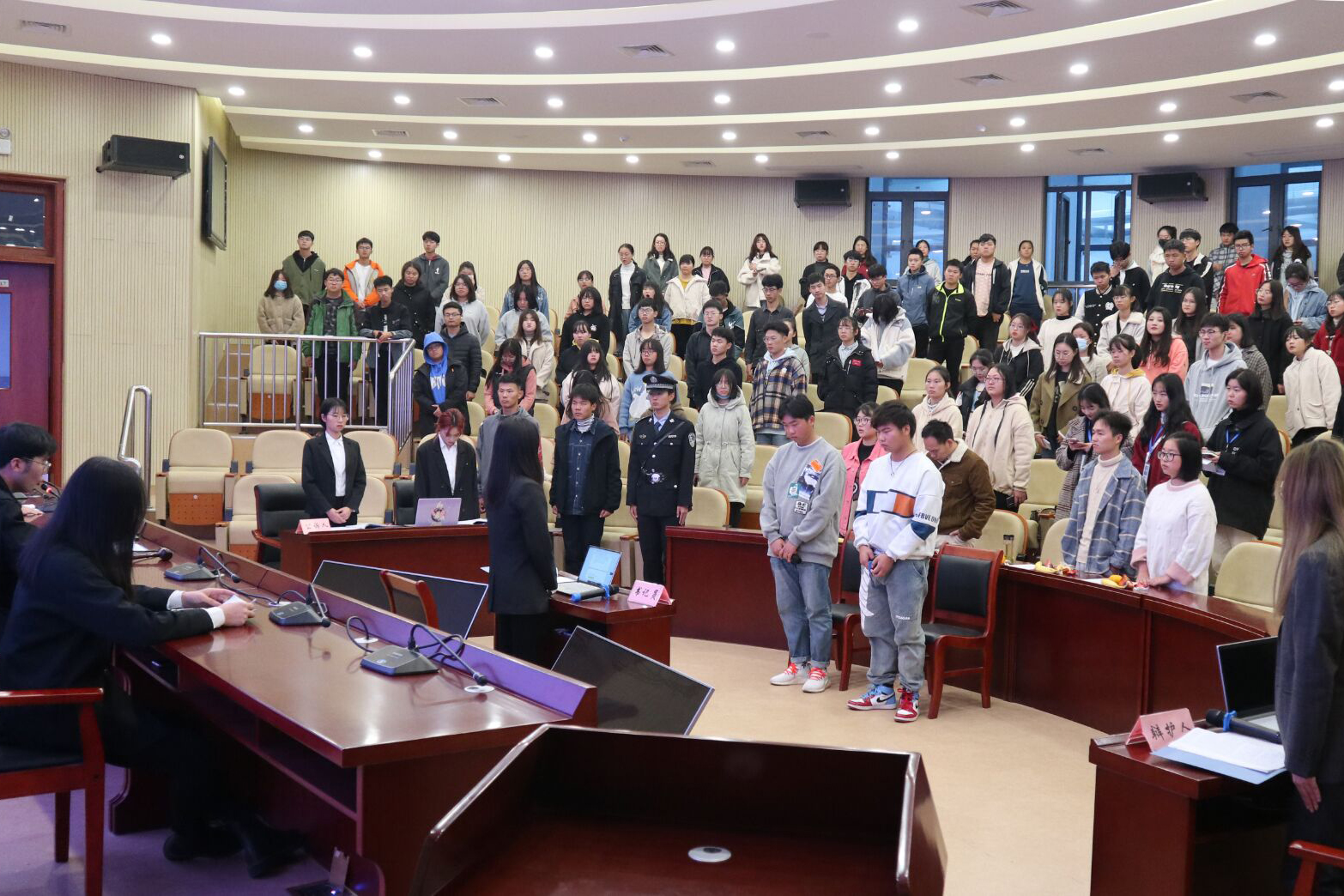 活动现场庄重严肃,真实再现法庭情境,以演出形式,由学生们担任审判长、陪审员、公诉人、辩护人、被告人、法警、罪犯及罪犯家属角色等,通过还原真实情景,模拟审判了一起“大学生抢劫案”。