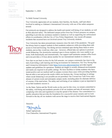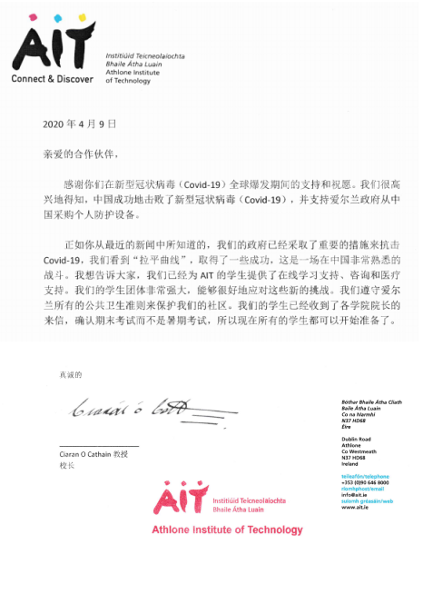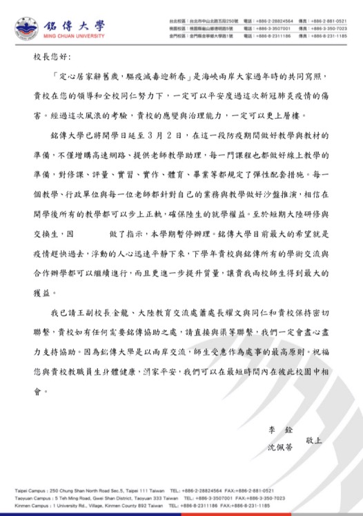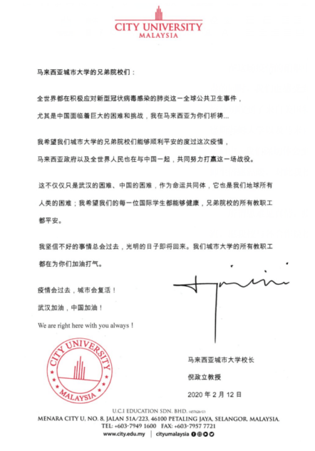 在此期间,我院分别收到了来自台湾铭传大学、马来西亚城市大学、德国希尔德斯海姆大学、爱尔兰阿斯理工学院以及美国特洛伊大学等国(境)外合作院校发来的慰问信。在信中,我们深切体会到各院校对beat365师生的关怀和鼓励,令beat365师生倍感温暖。在这场没有硝烟的战争中,病毒无情人有情。疫情并没有阻碍我们与国(境)外院校的友谊与交流,愿我院与各合作院校友谊长存,携手并进。(国际交流与合作处(港澳台事务办公室)