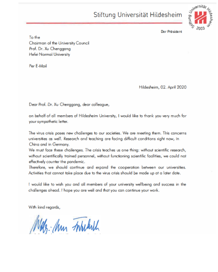 本网讯 全国众志成城抗击新冠肺炎疫情之时,我院陆续收到国(境)外多所友好合作院校发来的慰问信,他们向我院师生致以真挚的慰问,向学院所有奋战在抗疫一线的师生致以最崇高的敬意,祝愿疫情早日得到有效控制,并表示愿意更加积极地推动与学院的友好合作。