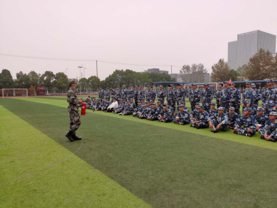 在安全区域,军训教官向新生们讲解了相关消防安全知识,让大家熟悉灭火器的使用方法。随后,新生们在教官的指导下实地操作灭火器扑灭“火情”。