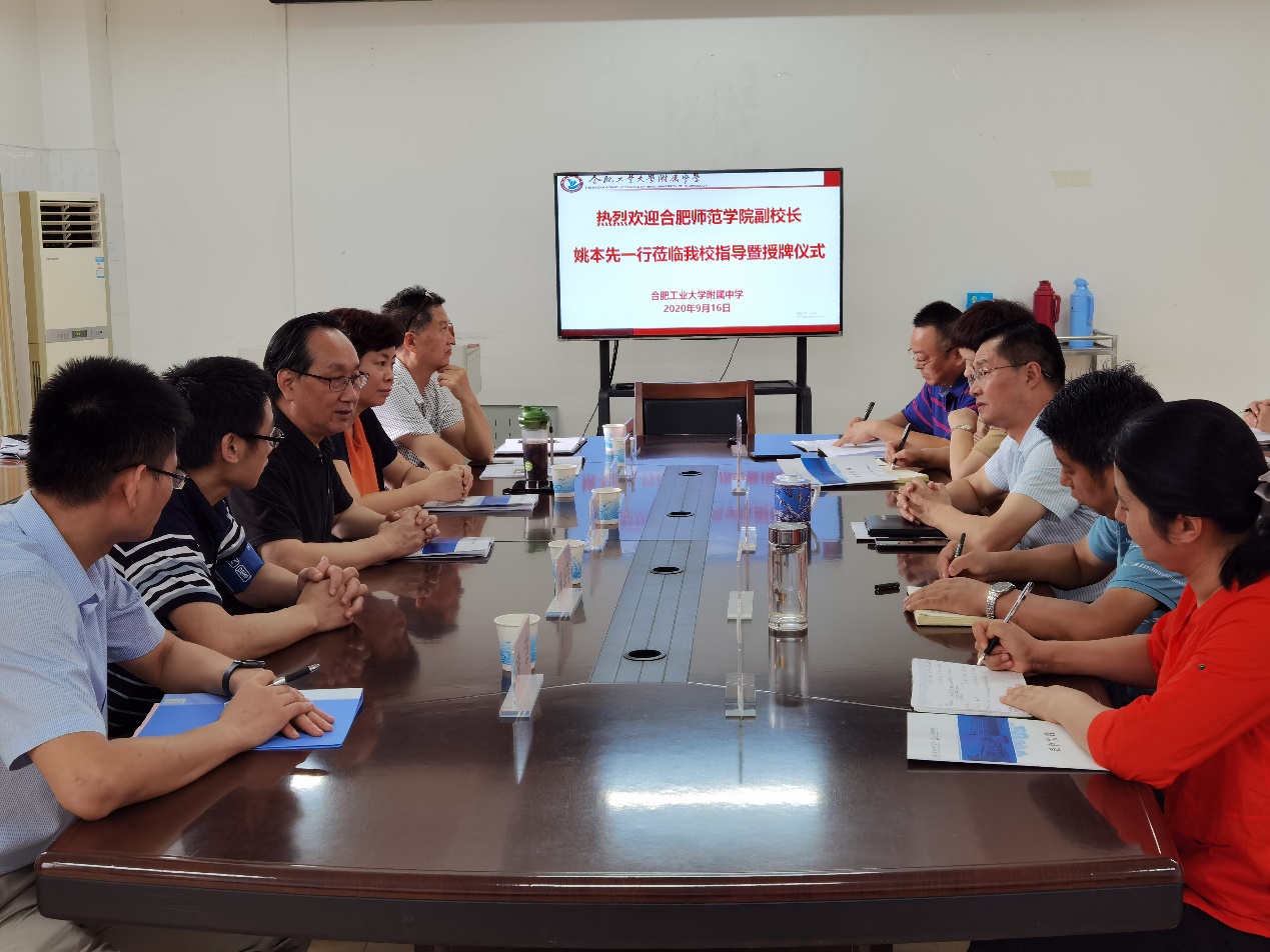 本网讯 9月16日下午,为落实立德树人根本任务,强化师范生培养,副院长姚本先在教务处处长胡昂、化学与化学工程学院院长董华泽等一行6人陪同下,赴合肥工业大学附属中学实习基地考察。合肥工业大学附属中学校长刘以成、党总支书记黄长喜、副校长商红、党总支副书记薛珍、办公室主任谢正春等热情接待了姚本先一行,并进行了热烈的会谈和隆重的授牌仪式。