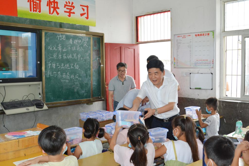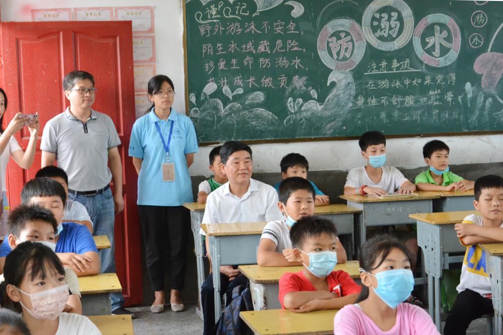 本网讯 8月26日,党委副书记吴昕春在组织部、机关一党委、团委、经济与管理学院等单位负责人的陪同下,来到阜阳市颍东区口孜镇洪杨小学看望慰问行知学堂小先生和留守儿童。