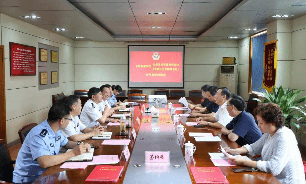本网讯 7月21日,院党委书记徐成钢、副院长姚本先率办公室、教务处、计算机学院主要负责同志前往安徽公安职业学院,就学校与安徽省公安教育研究院(安徽公安学院筹备处)深化合作办学事宜进行对接并签订人才培养合作协议。安徽公安职业学院党委书记田扬畅主持签约仪式。