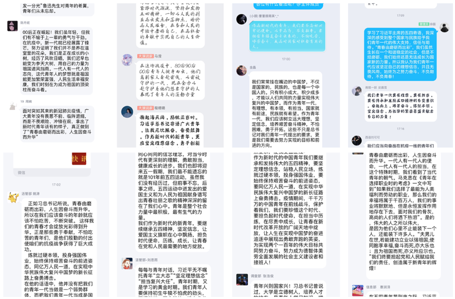 5月4日,全院各级团组织团员青年通过QQ群、微信群等网络信息化平台,自主学习习近平总书记五四寄语,并线上交流学习心得。5月6日下午,学院共青团理论学习小组在行知楼举行习近平总书记五四寄语专题学习会。