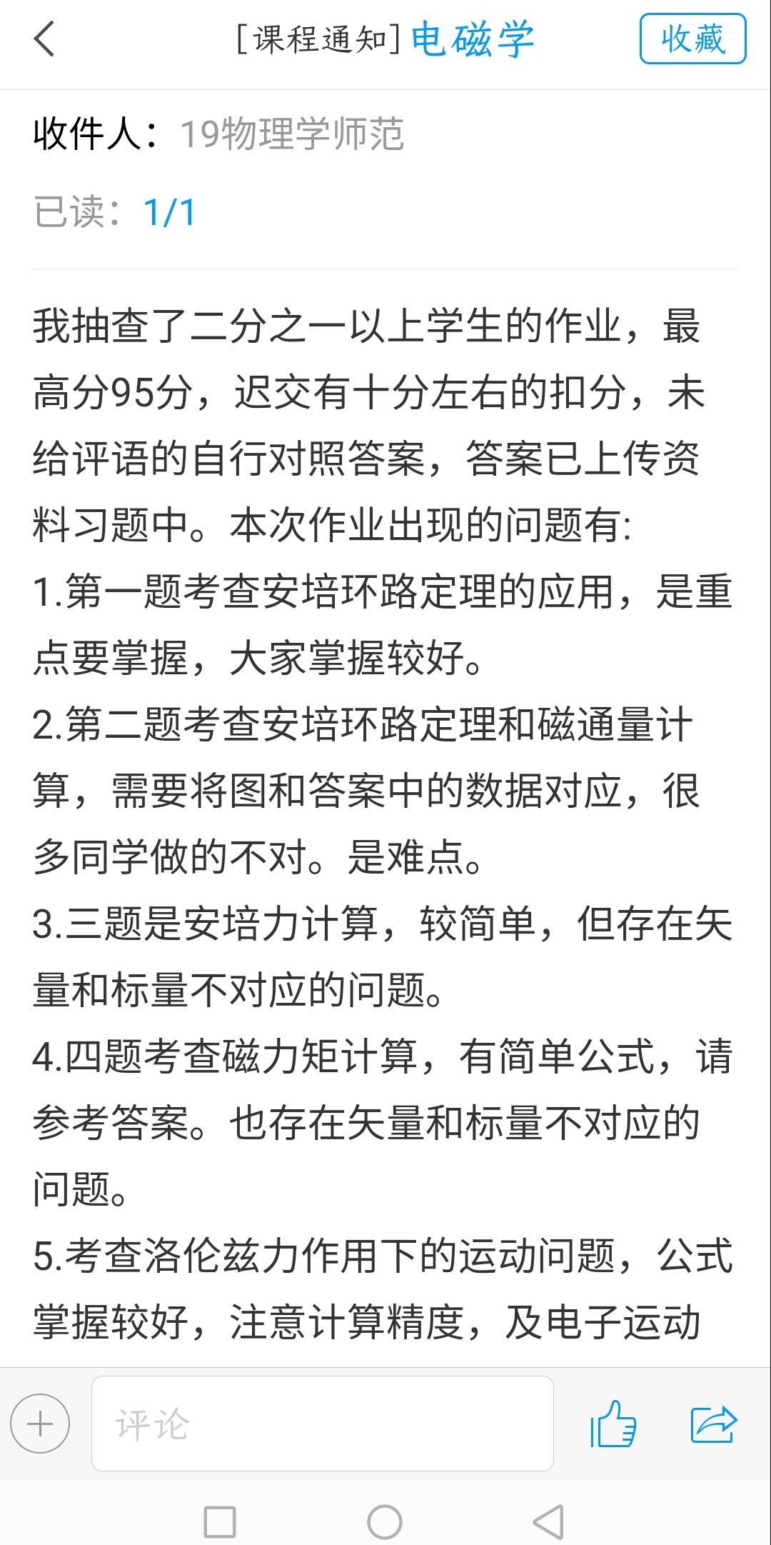 为巩固、加强对知识点的掌握,每次课后老师会布置相关的习题,也经常提醒我们截止时间。最让我感动的是老师认真批改作业的过程,可以想象工作量有多大。对于提交的每一份作业,老师都会认真地批改,并在学习通中发布作业反馈通知,提醒我们每题的相关知识点,以及出错比较多的地方,并对没有达到92分的同学作业,给出相应评语。