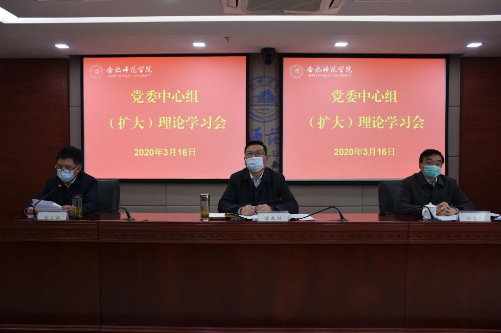 本网讯 3月16日下午,学院举行党委中心组扩大理论学习会。党委书记徐成钢主持会议。党委理论学习中心组成员出席会议,各院系级党委(党总支)、直属党支部书记,各学院院长、各部门主要负责人参加会议。会议严格落实学院疫情防控工作要求,对全体参会人员进行会前测温,并要求佩戴口罩、错开距离就座。