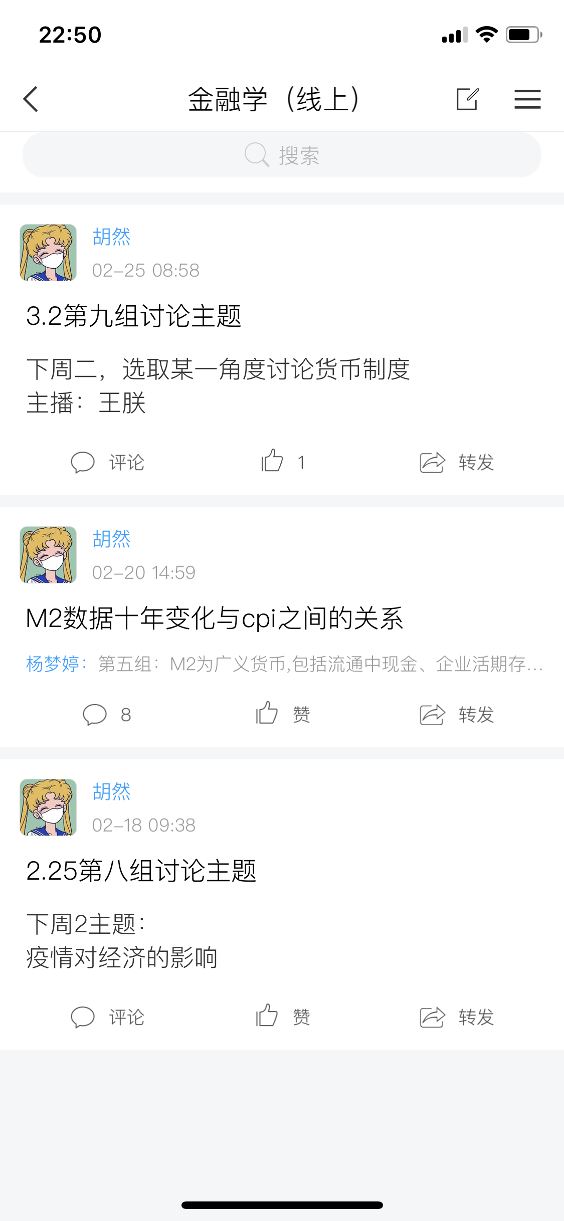 在我亲身实践线上教学之前,我对在线学习的印象就是每个学生“单打独斗”,“各自为政”。但当我把线下分组讨论搬到线上,发现小组讨论能在一定程度上帮助学生减轻在线学习的孤立感,并让学生在相互支持中提升学习参与度和积极性,首先我先将学生按人数分组,采取自由组合,确定后分小组发布下节课的讨论主题,该组同学有一周的准备时间,然后推选一人作为主播,进行直播演示,可以辅助ppt等工具。比如18国贸总共49人,分为10组。在直播的过程中,由于大家很久没有见面,又相互熟悉,气氛比较轻松,甚至比线下教学的讨论环节还要更热烈一些。