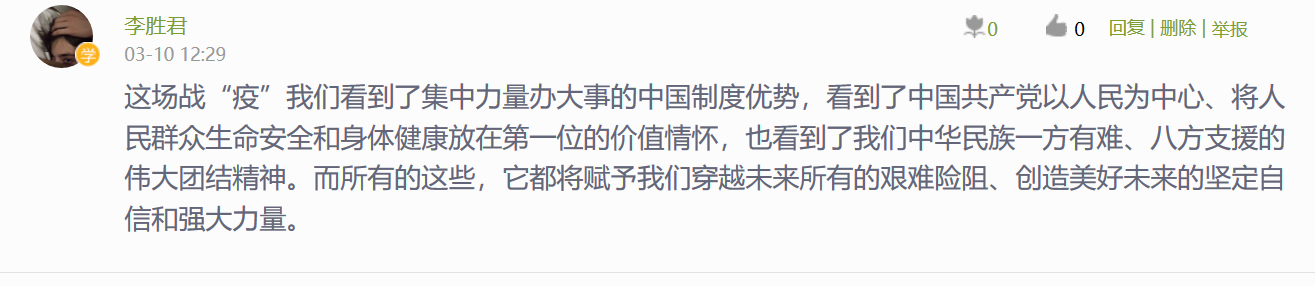 此次疫情防控“思政大课”直播,解读了党中央关于疫情防控的决策部署,分析了中国抗疫彰显的中国共产党领导和中国特色社会主义制度的显著优势,讲述了防疫抗疫一线的感人故事,发挥了高校思政课落实立德树人根本任务的关键课程作用,引导大学生传承和弘扬爱国主义精神,增强中国特色社会主义道路自信、理论自信、制度自信、文化自信。