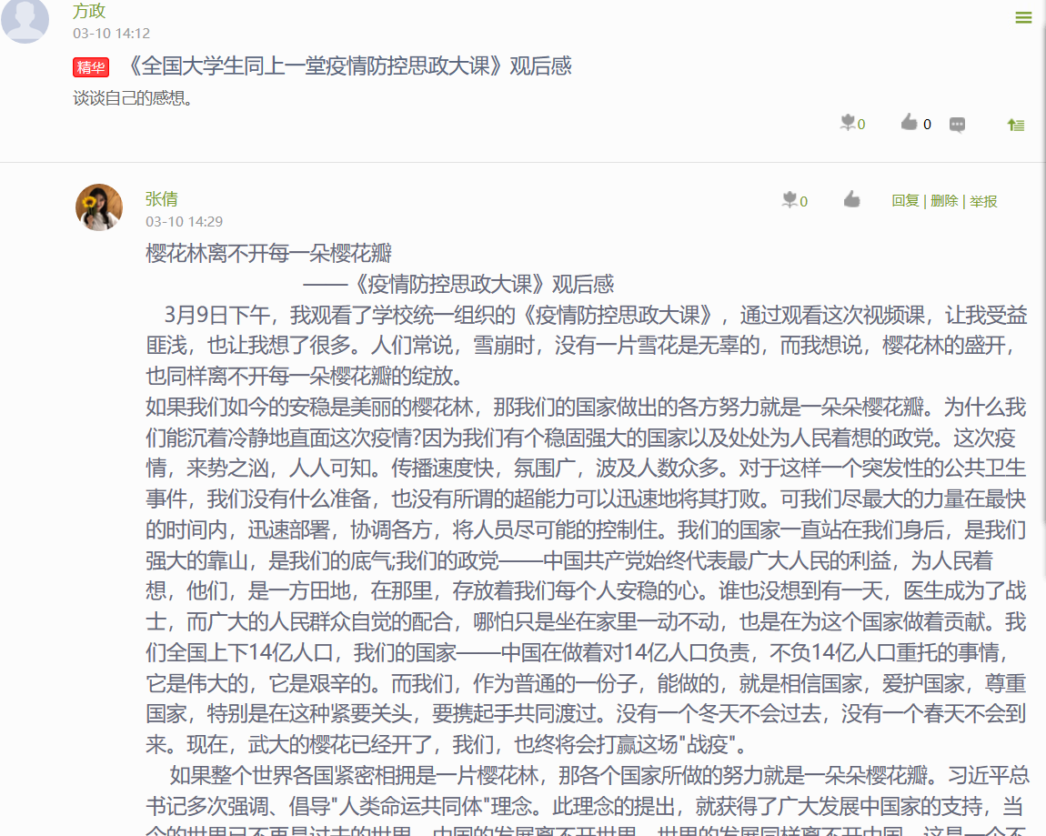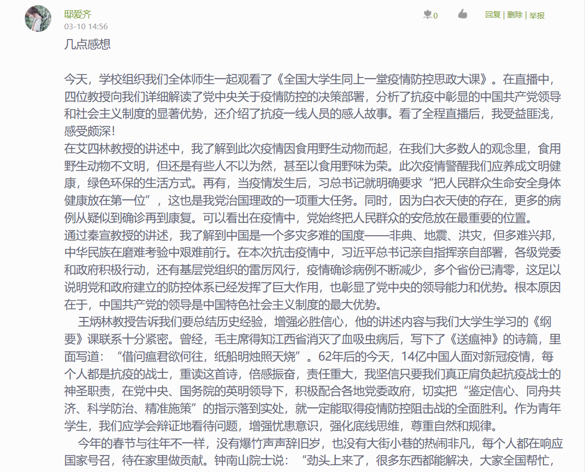 本网讯 为贯彻落实教育部社科司《关于组织“全国大学生同上一堂疫情防控思政大课”的通知》和省教育厅相关要求,引导广大学生增强“四个意识”、坚定“四个自信”、做到“两个维护”,坚定在以习近平同志为核心的党中央坚强领导下打赢这场疫情防控人民战争、总体战、阻击战的信心和决心,我院积极组织师生参加3月9日下午由教育部社会科学司、人民网联合举办的“全国大学生同上一堂疫情防控思政大课”活动。