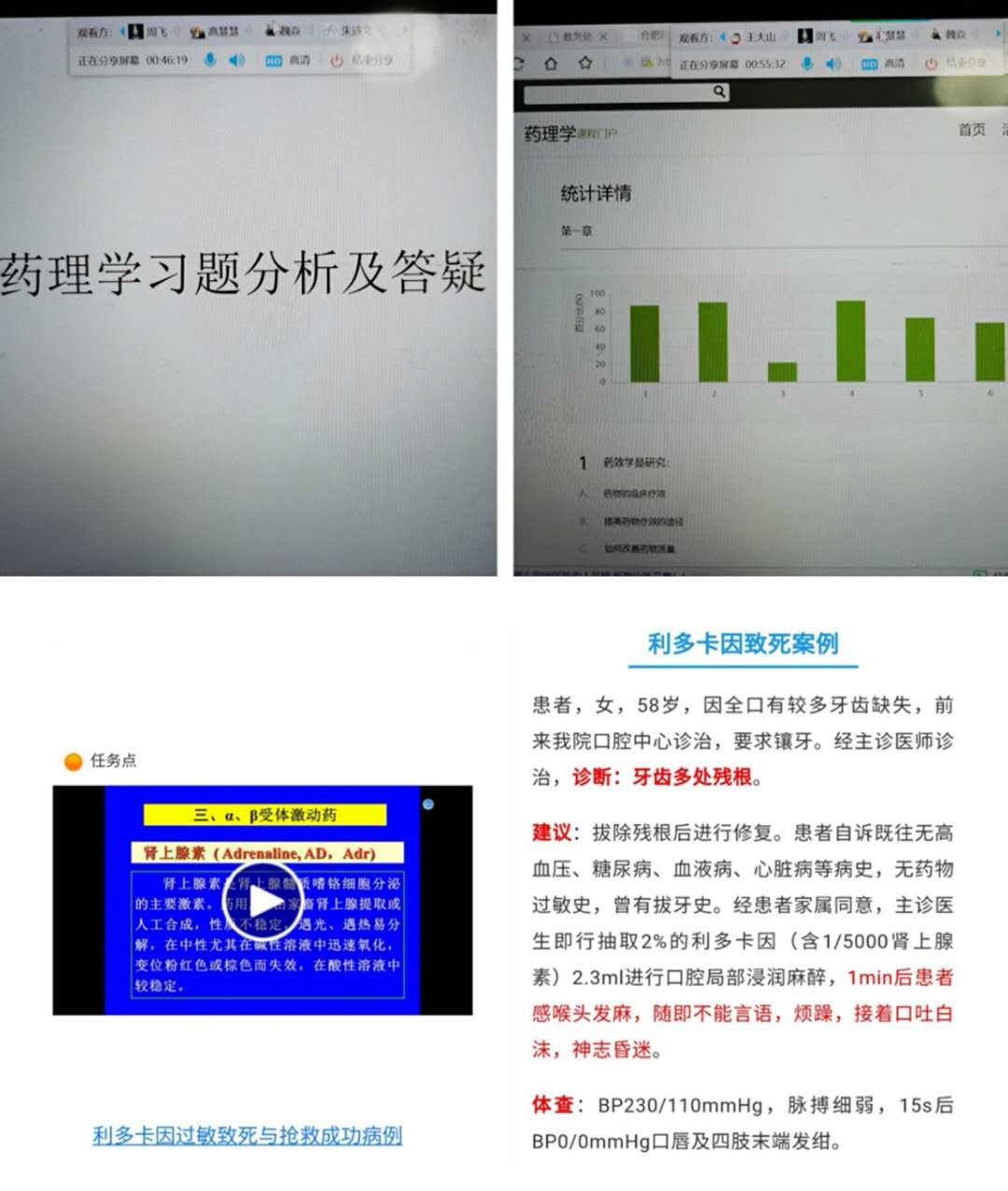 一、多途径、多方式,重积累、早准备。利用各种教学平台加强学习,借鉴线上教学创建方法及线上教学内容设计原则,对自己将要教授的课程进行内容创建和补充。在学习和实践过程中,一方面认识并掌握线下面对面课堂中较少使用的网络教学、慕课、翻转课堂等概念和区别;另一方面提高对各种教学手段的运用,学用结合不断改进和提升教学方式。根据所授课程特点,对机理性较强的《药理学》课程采取多任务点视频、多案例分析讨论的形式吸引同学注意和思考、提高同学参与积极性,同时以小测验的方式对学生学习效果进行评价,最后以课程作业的方式对所有知识点进行针对性考核。通过平台统计数据,对学生学习时间及薄弱处进行针对性分析,借助在线直播的方式对学习内容和练习研讨加以提问、引导、分析,帮助学生进一步加深对知识点的理解和认识。