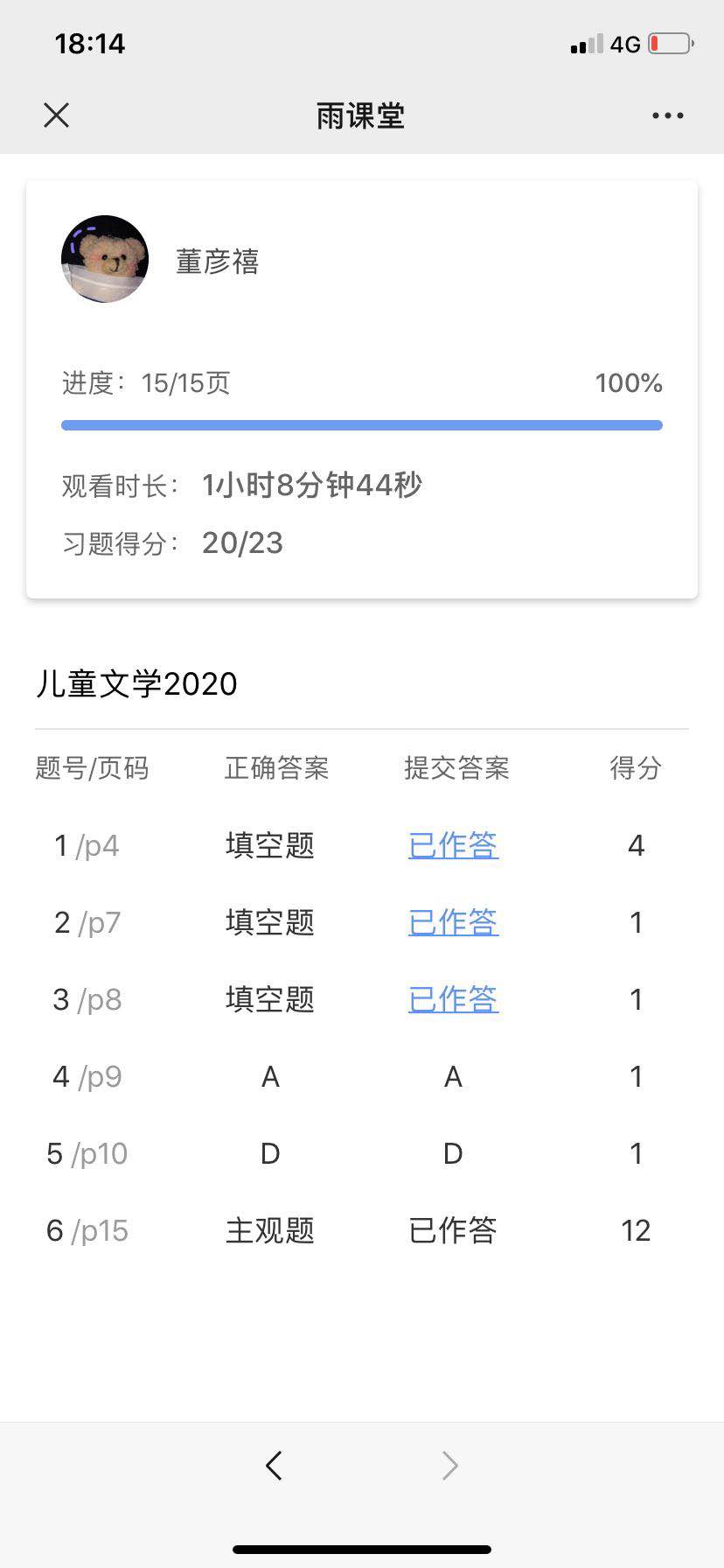 疫情防控特殊时期,我承担的两门课《外国文学》与《儿童文学》都采取了混合式线上教学模式,并采用“雨课堂”课程平台。原本我准备申请会员,以课堂直播的方式开课,后来根据上级要求,各位教师充分利用已经建设好的优质课程资源,不鼓励所有教师开直播。“雨课堂”的技术服务人员也及时与我们沟通,提供了一些不必通过会员就可以开课的方案。“雨课堂”的好处在于可以充分利用丰富的网络资源和各学校录制的慕课资源。经过充分考虑,我决定用“雨课堂”平台,采取“PPT+微信配音+视频+习题”的方式,并按照课表时间签到、答疑与交流。为保证课堂交流讨论时间,我另外又采用了微信课程群的交流方式。