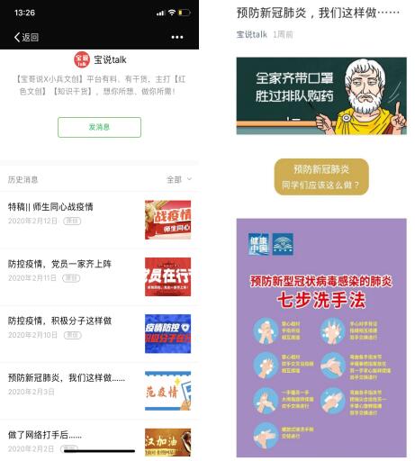 新型冠状肺炎发生以来,屠家宝老师就不断收到同学的信息:“老师,我们村路口被封了”、“辅导员,我们小区有人‘被带走’了”、“老师,我男朋友发热了”……隐约传递着他们的着不安和焦虑,有时还有同学半夜睡不着,告诉老师说在家很着急。针对这种情况,屠老师就和一些同学重点谈心,给他们讲政策,引导他们安心理性对待、科学预防。他通过微信公众号“宝说talk”连续发布“不信谣、不传谣”“科学预防知识”“师生同心战疫情”等5篇文章,向同学们宣传党中央关于疫情防护的政策,积极宣传科学专业的“七步洗手法”“出行防护”等预防知识,提醒同学们警惕“双黄连可预防”等防控误区和网络谣言,教育引导同学们不信谣、不传谣、不恐慌。