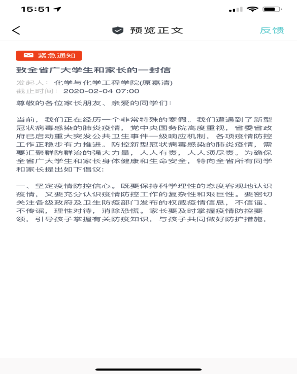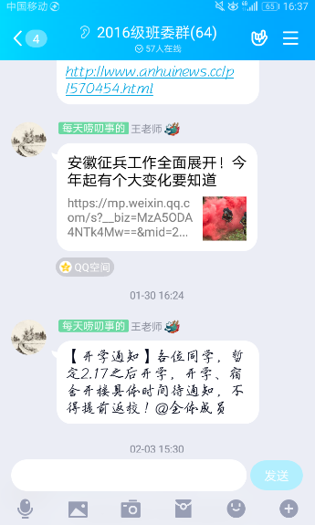 辅导员们充分利用班级微信群、QQ群,团学骨干群,辅导猫等网络平台,将党和国家、全省、学院党政关于防控新冠肺炎的精神传达给学生和家长,传播科学防控新冠肺炎知识,提示学生不造谣、不信谣、不传谣,积极弘扬疫情防控工作中的正能量。