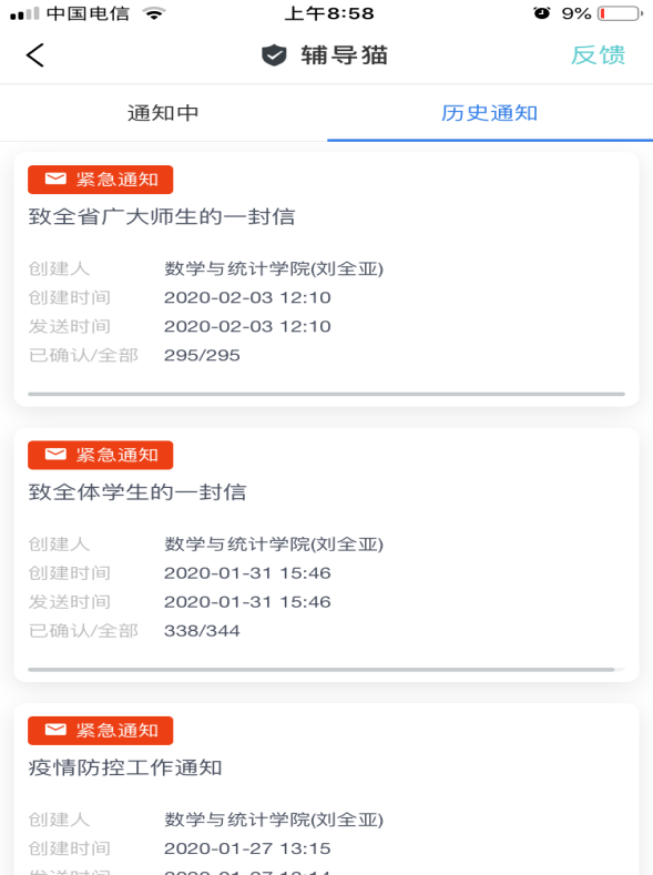 落实上级精神,疏导学生情绪。全体辅导员积极贯彻落实教育部、省教育厅关于延迟开学的精神,引导广大同学按照学院的要求不提前返校,安心居家参与疫情防控。辅导员利用“辅导猫”引导收集防控疫情信息表,引导学生进行新冠肺炎自诊,帮助学生有效克服对疫情的恐惧心理。